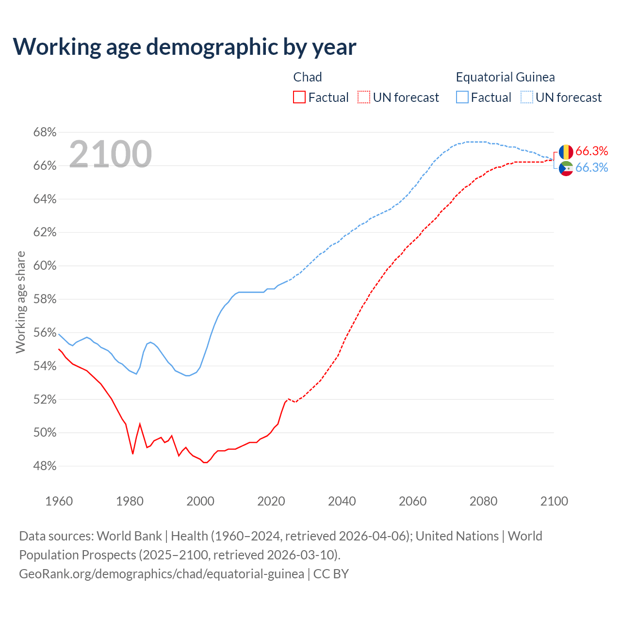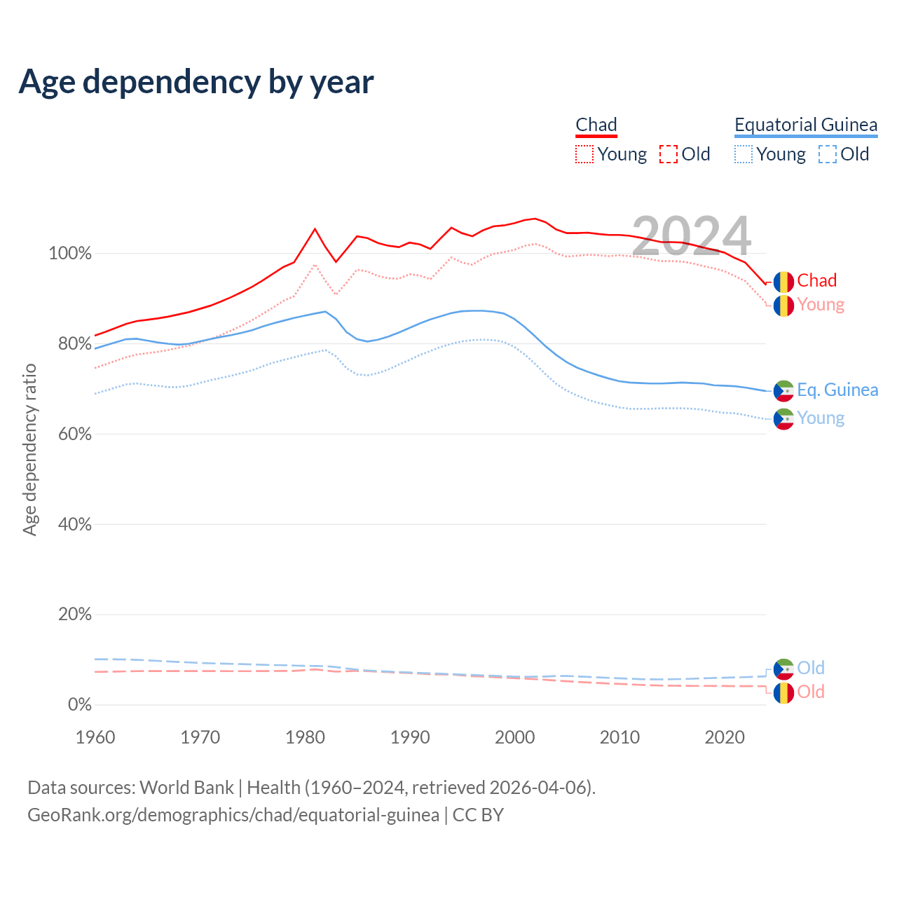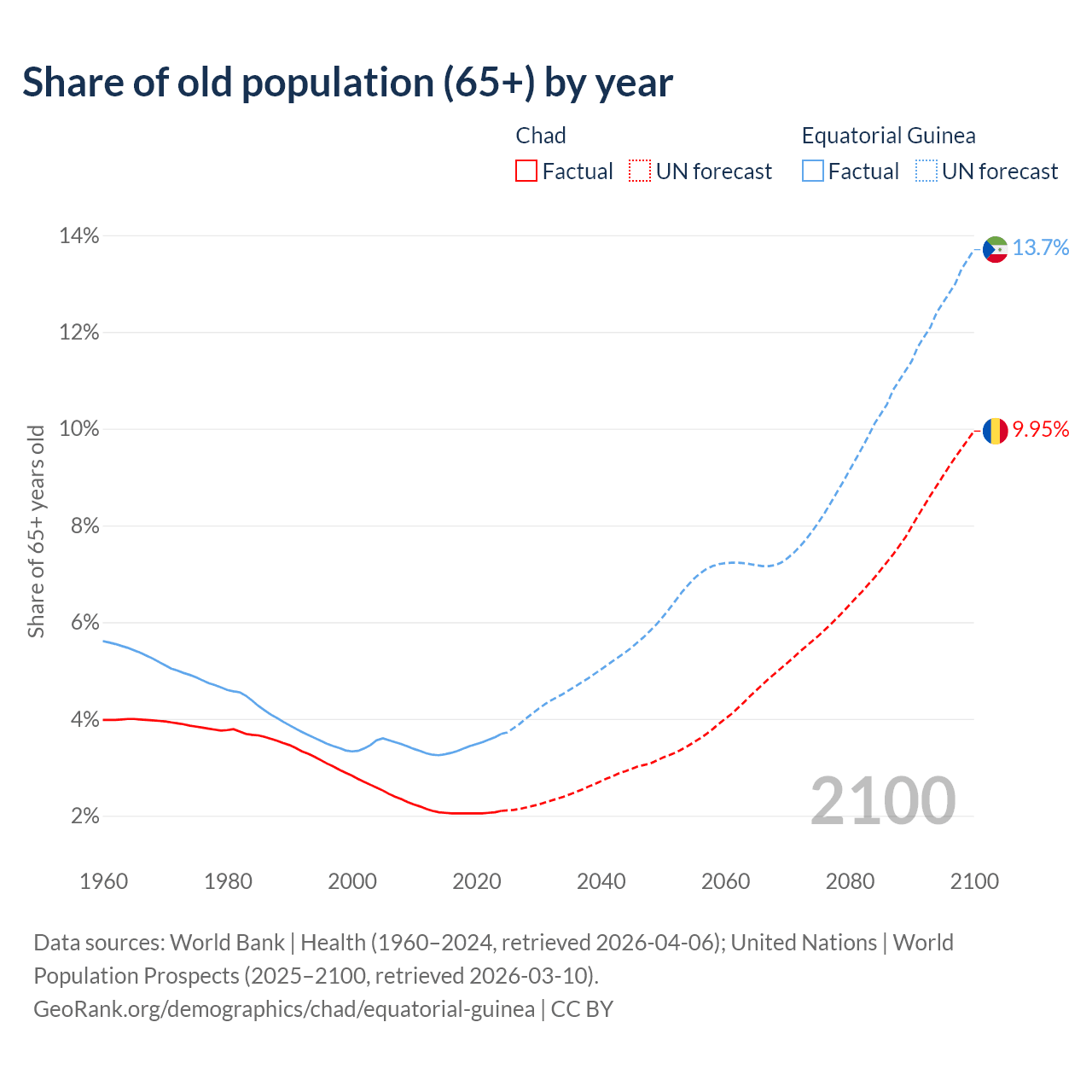 The share of older people aged 65 and over is 2.1% in Chad and 3.69% in Equatorial Guinea. Life expectancy in Chad compared to Equatorial Guinea .