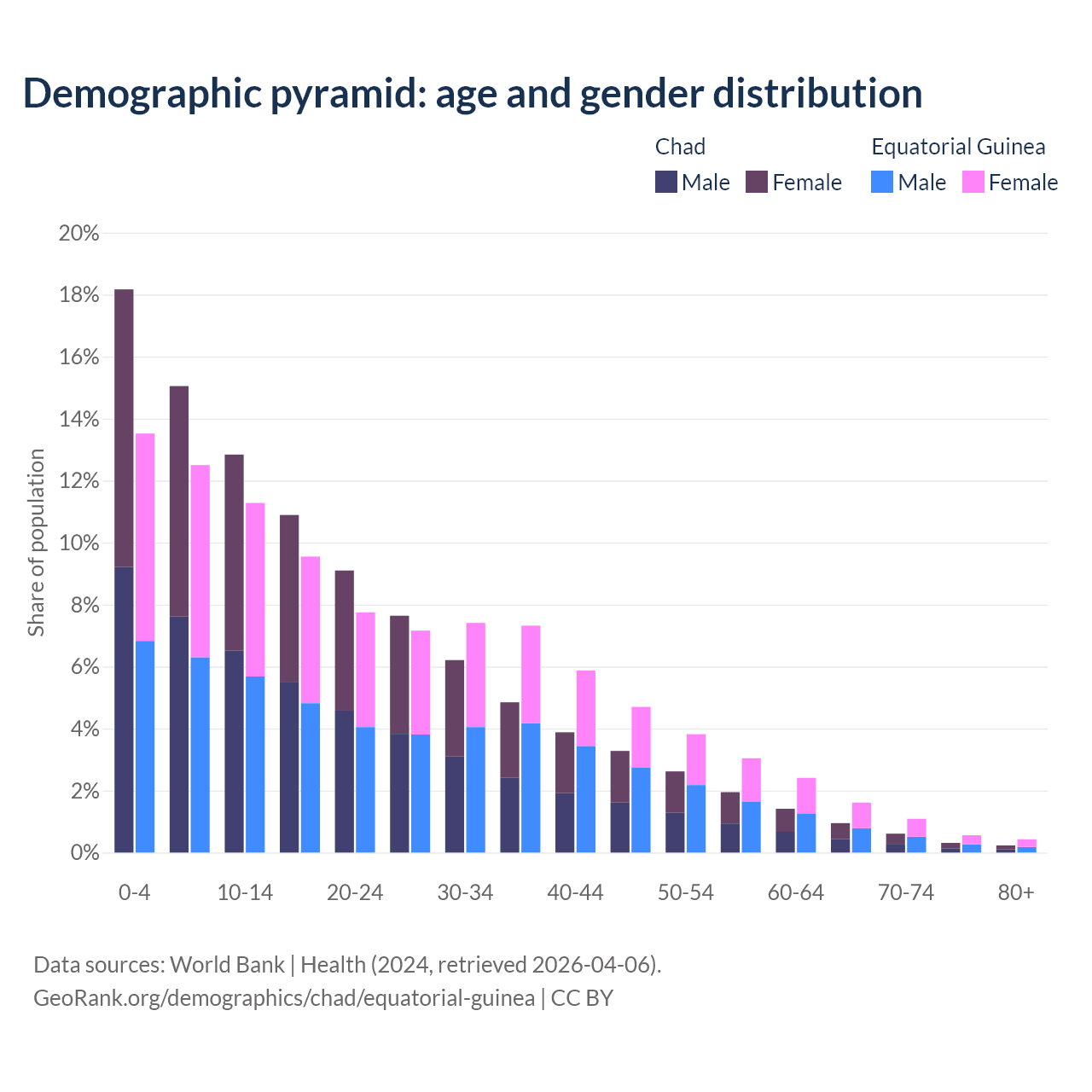 - Chad is ranked 192/196 by median age (oldest to youngest) vs 148/196 for Equatorial Guinea.