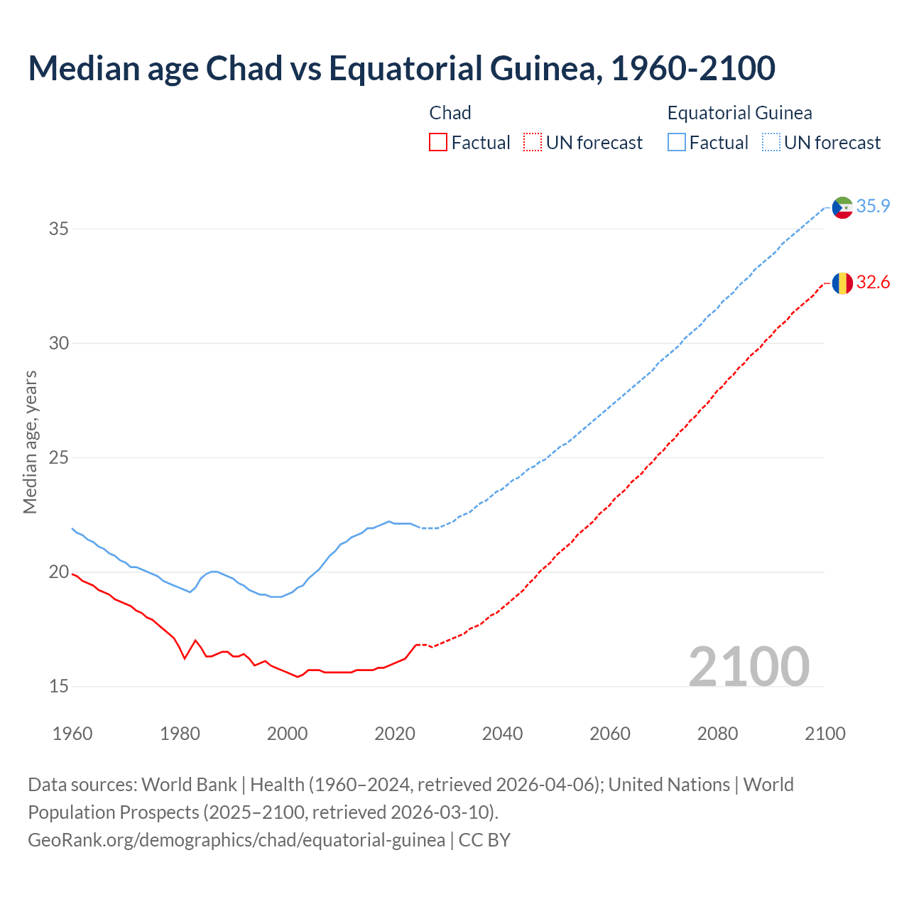 Median age Chad vs Equatorial Guinea, 1960-2100