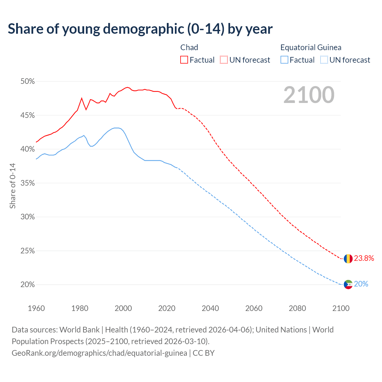 - The share of young demographic (0-15 years old) in Chad is 46.1% vs 37.3% in Equatorial Guinea.