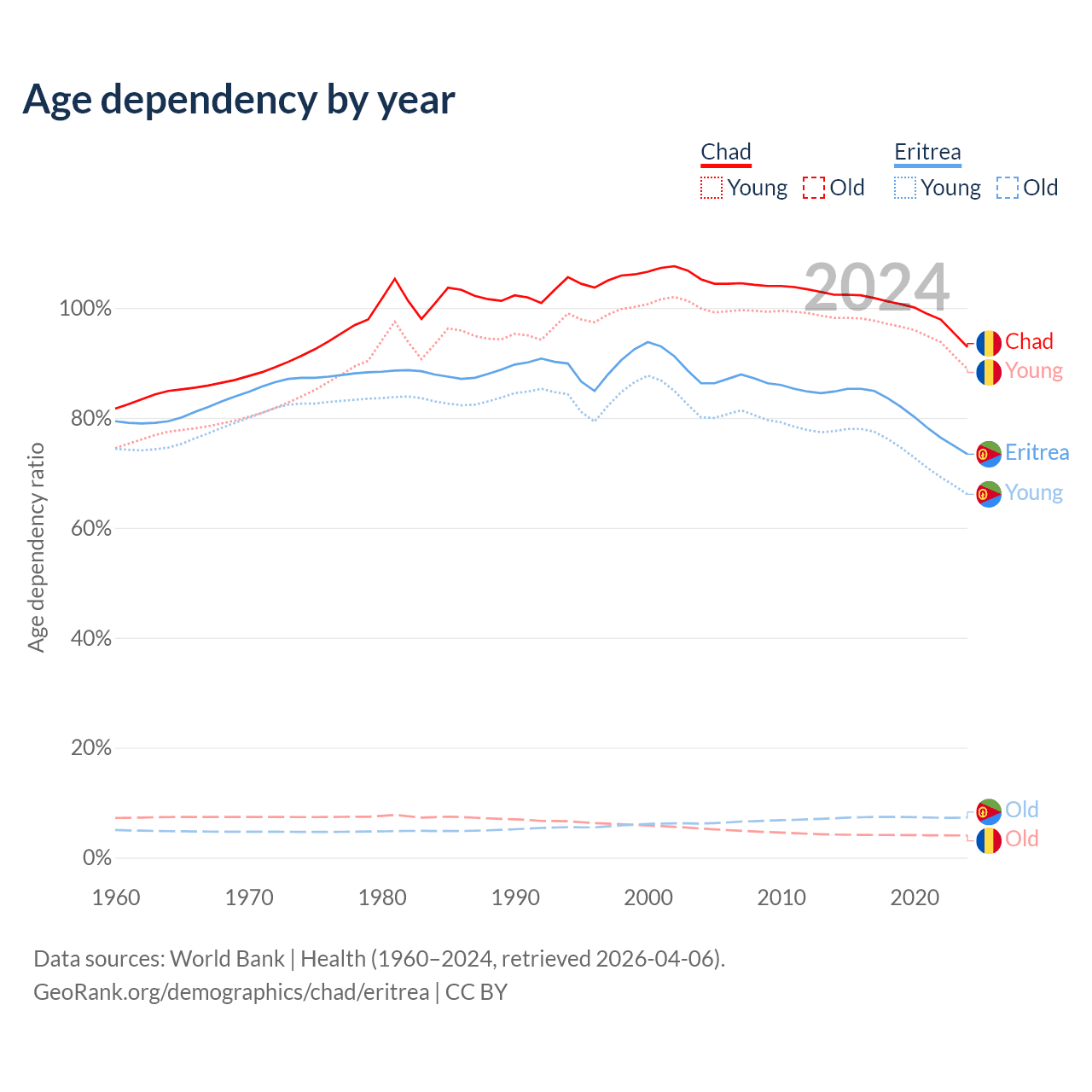 - Chad is ranked 192/196 by median age (oldest to youngest) vs 168/196 for Eritrea.