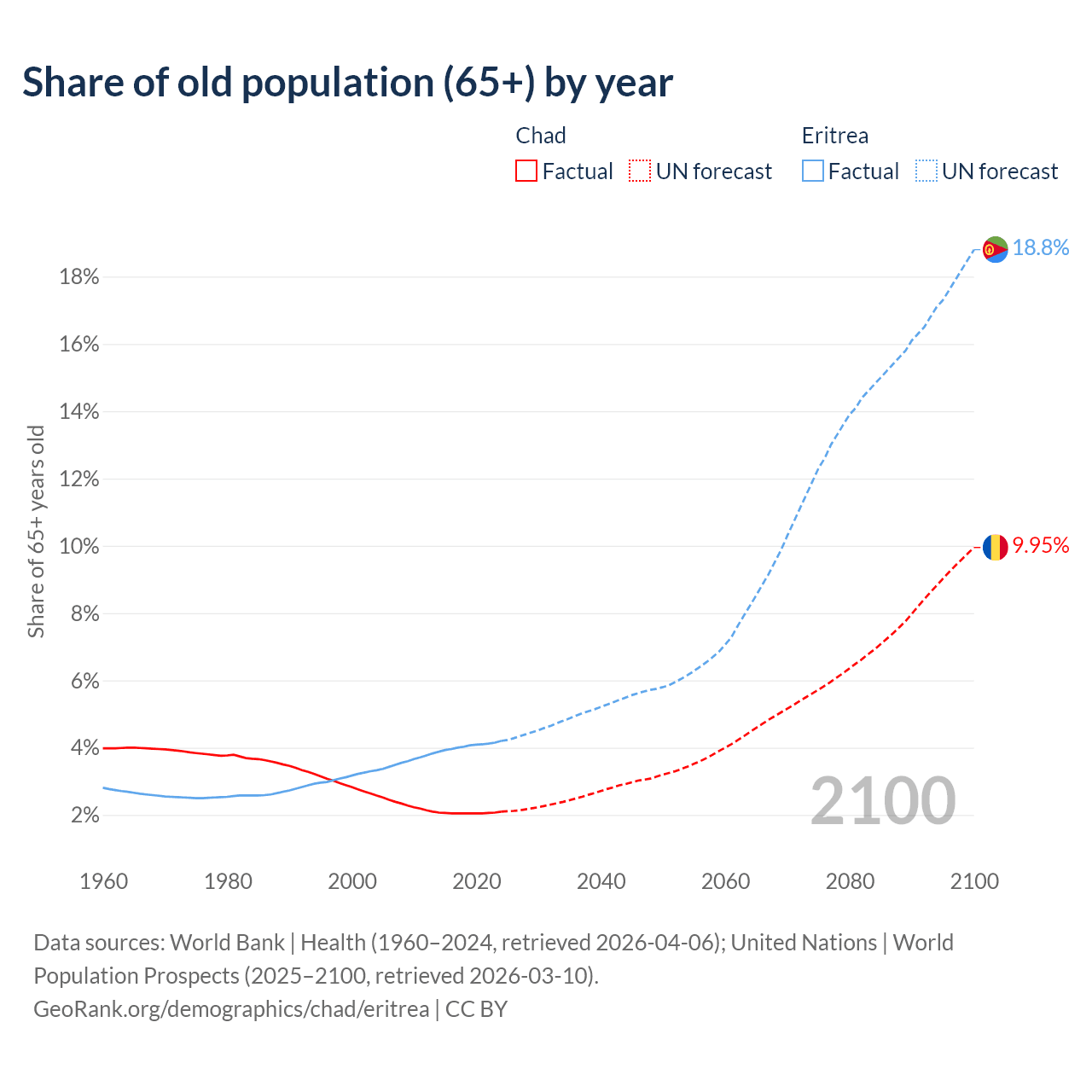 - The share of old-age demographic (65+) in Chad is 2.1% vs 4.2% in Eritrea.