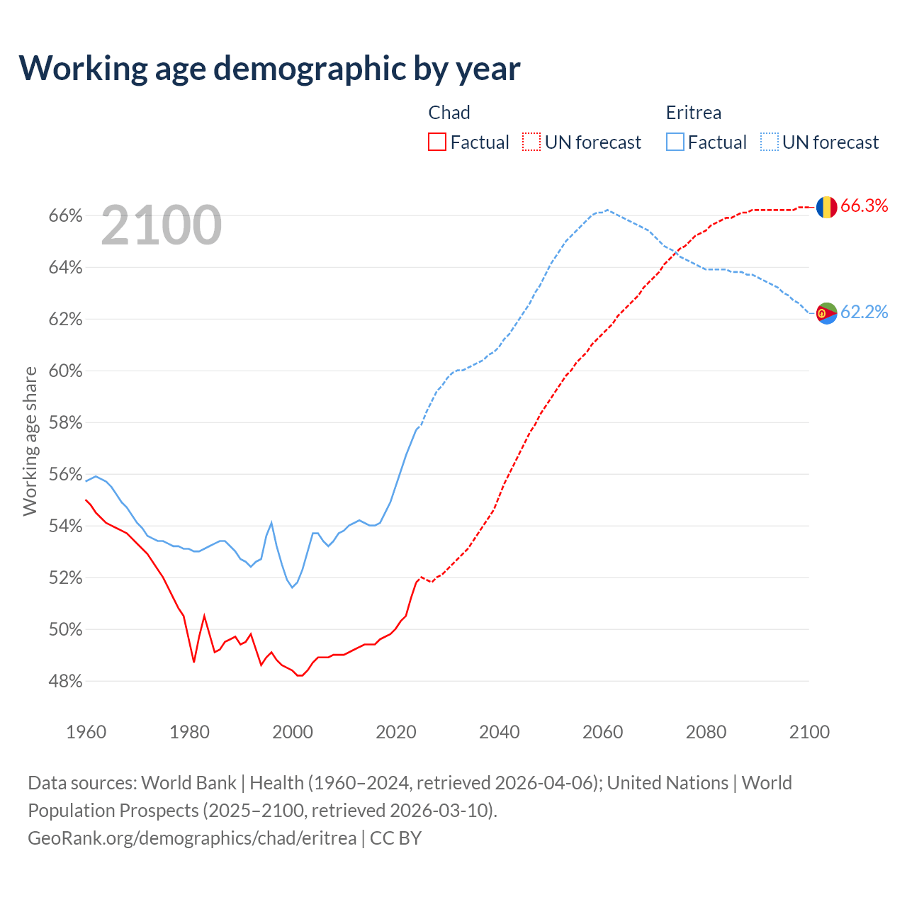 The share of older people aged 65 and over is 2.1% in Chad and 4.2% in Eritrea. Life expectancy in Chad compared to Eritrea .