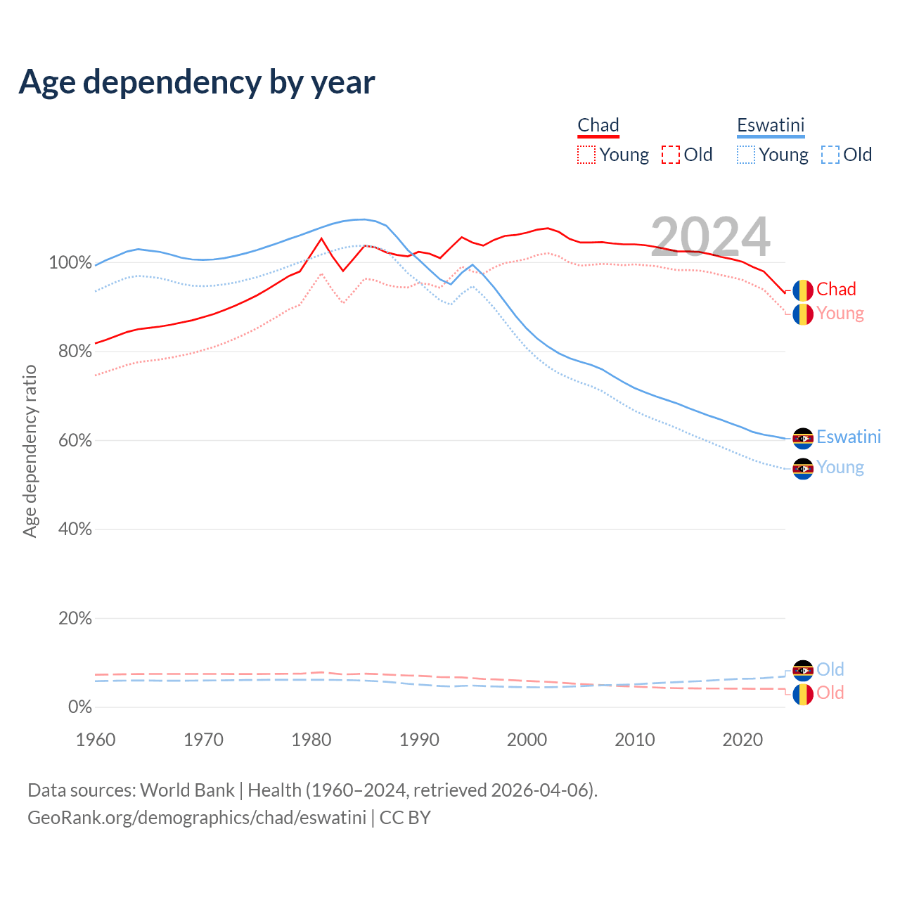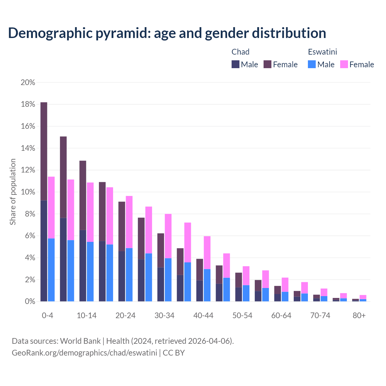 - Chad is ranked 192/196 by median age (oldest to youngest) vs 141/196 for Eswatini.