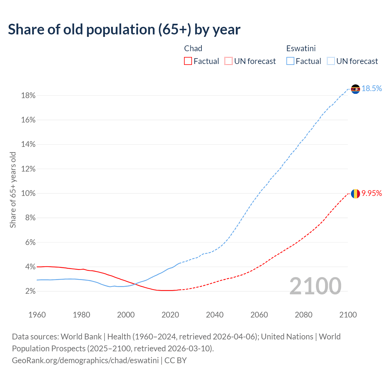- The share of old-age demographic (65+) in Chad is 2.1% vs 4.26% in Eswatini.