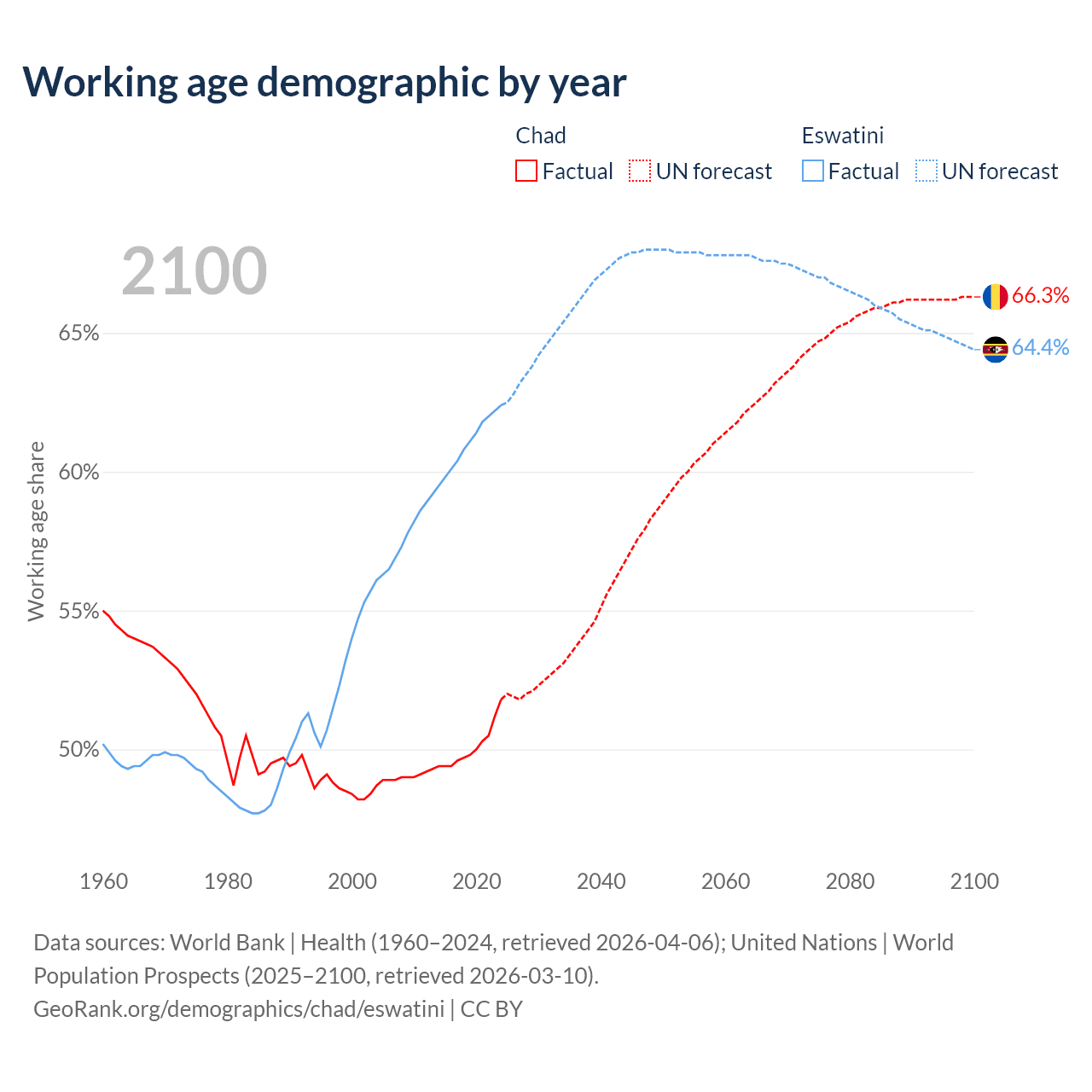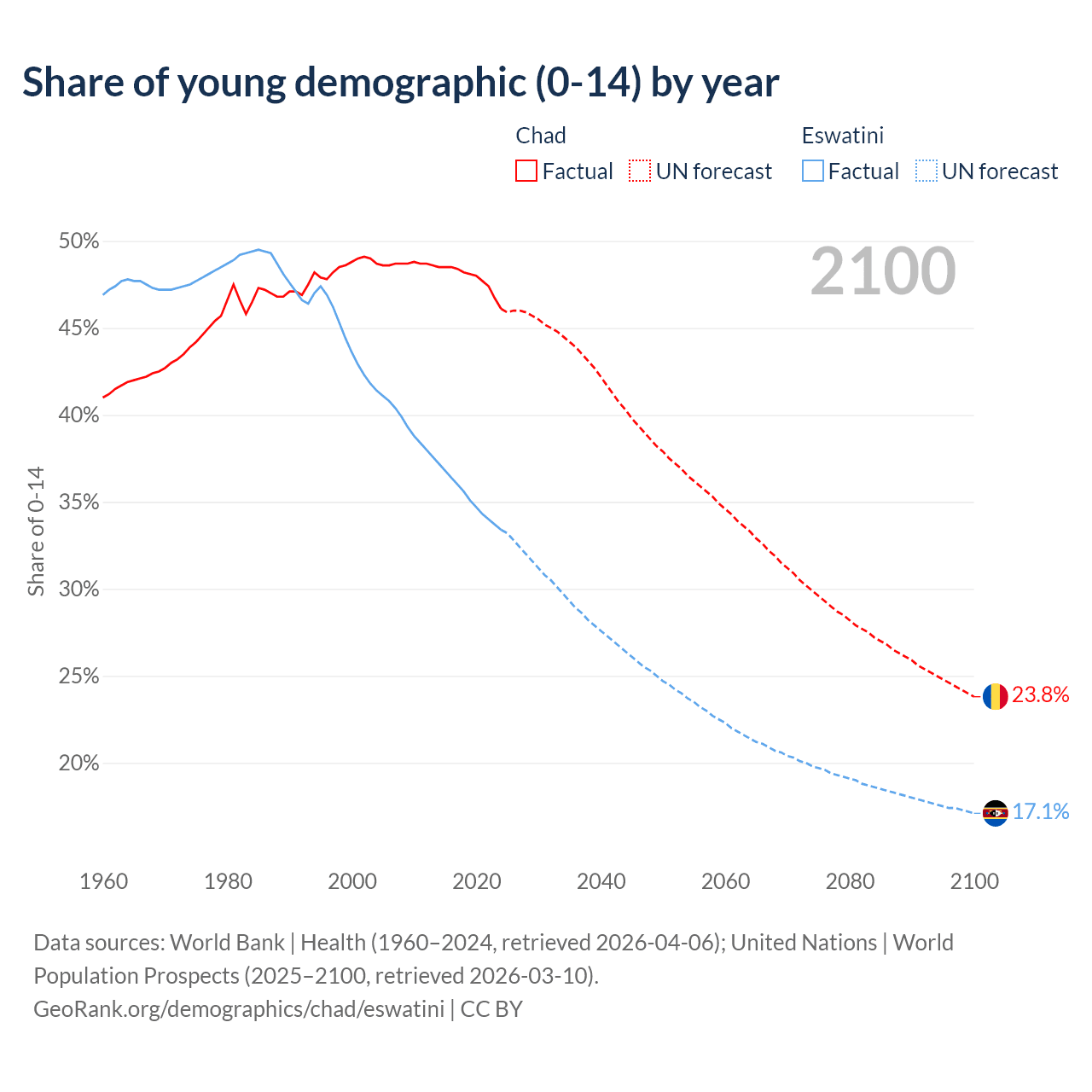 - The share of young demographic (0-15 years old) in Chad is 46.1% vs 33.4% in Eswatini.