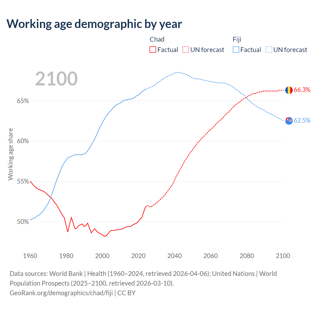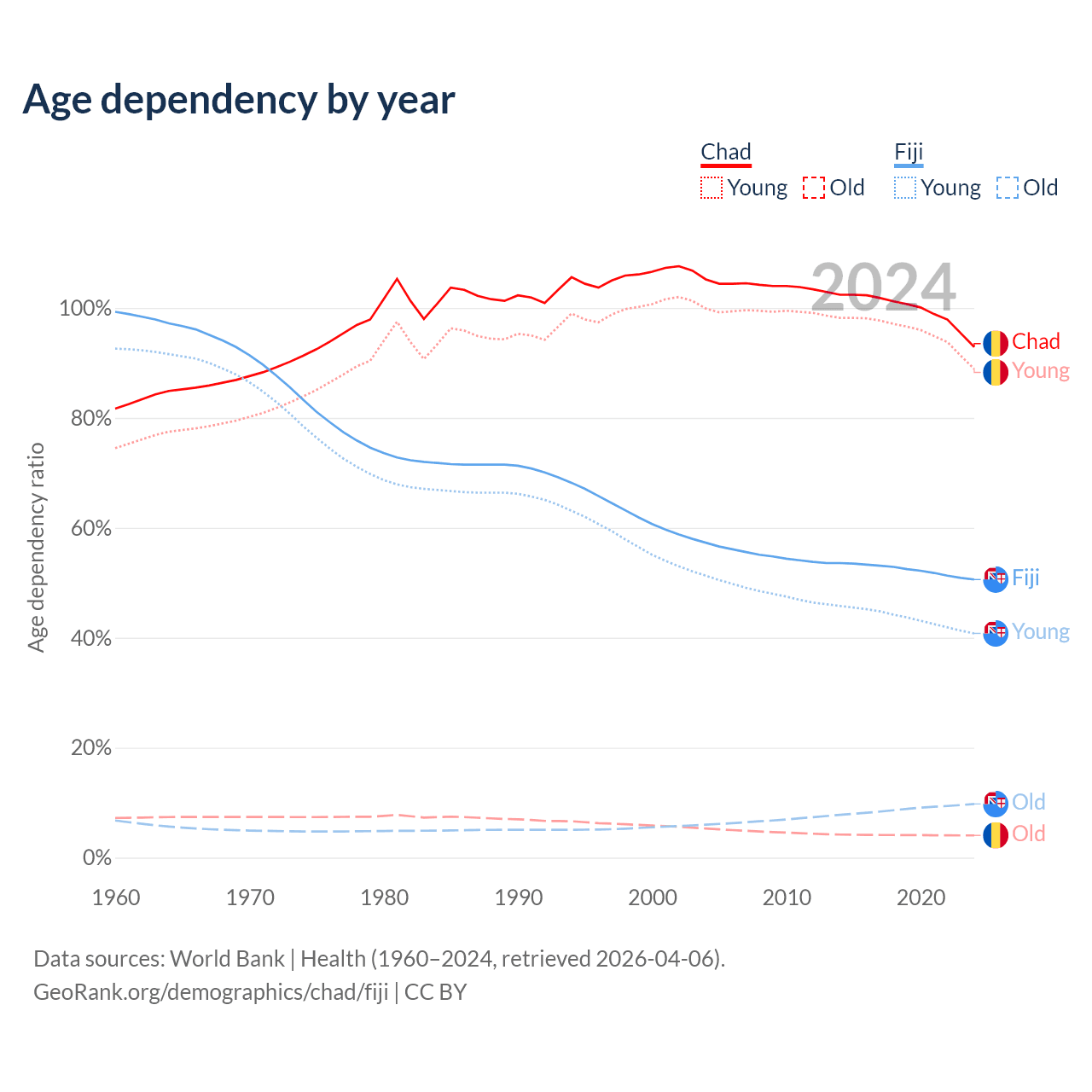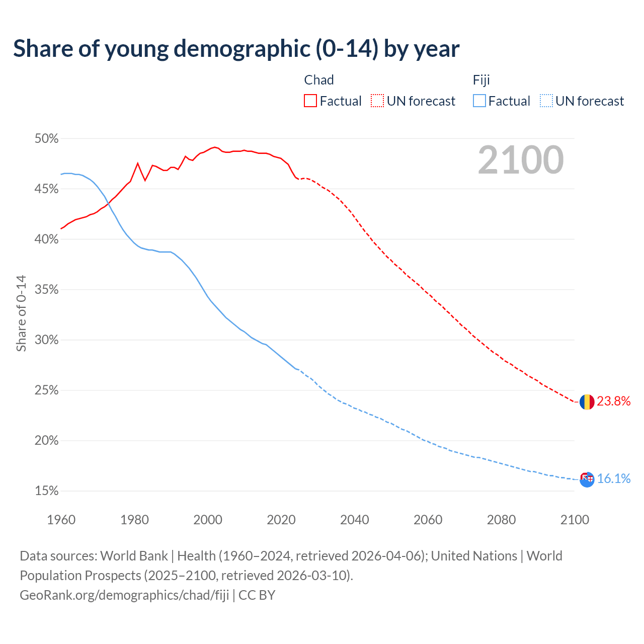 - The share of young demographic (0-15 years old) in Chad is 46.1% vs 27.1% in Fiji.