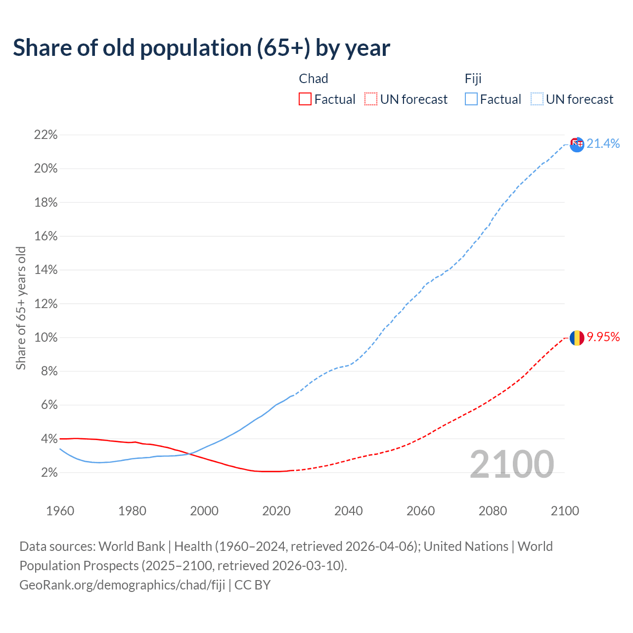 - The share of old-age demographic (65+) in Chad is 2.1% vs 6.49% in Fiji.
