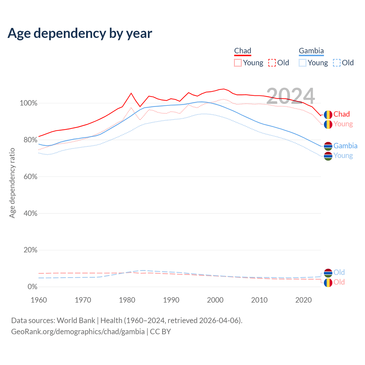 - Chad is ranked 192/196 by median age (oldest to youngest) vs 171/196 for the Gambia.