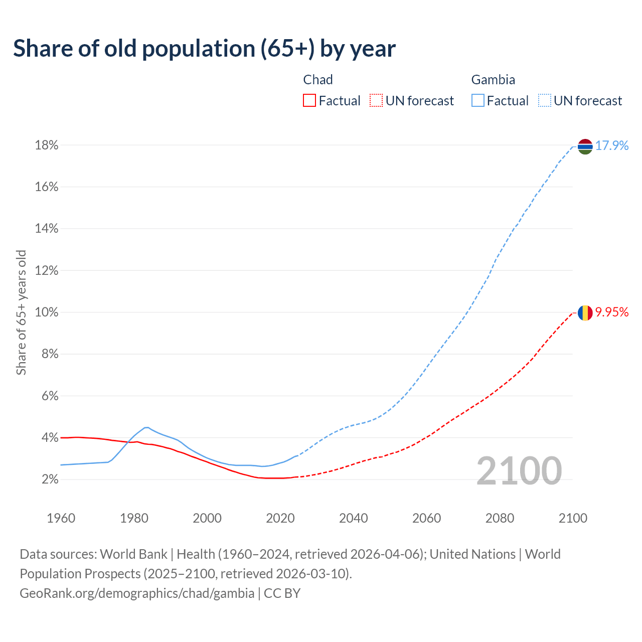 The share of older people aged 65 and over is 2.1% in Chad and 3.08% in the Gambia. Life expectancy in Chad compared to the Gambia .