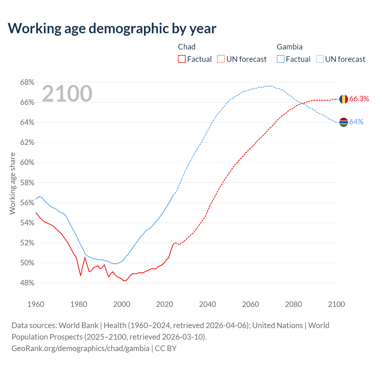 - Chad has 11.3M working age adults (aged 15-64) vs 1.64M in the Gambia.