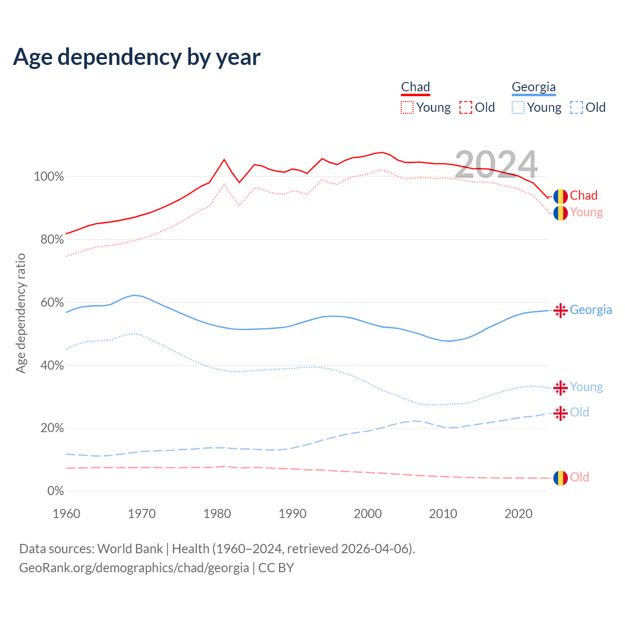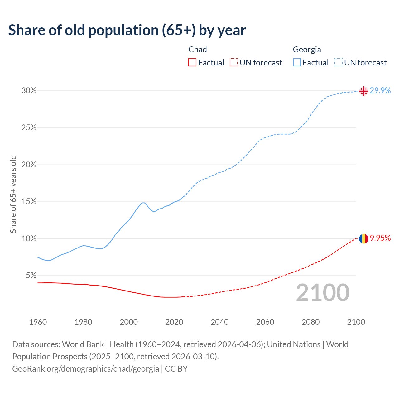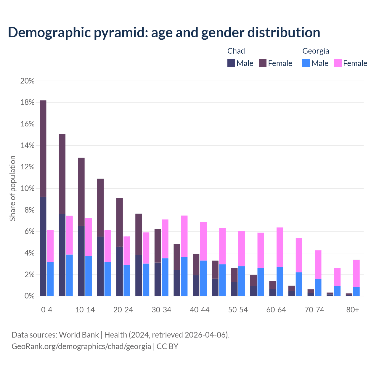 - The share of old-age demographic (65+) in Chad is 2.1% vs 15.6% in Georgia.