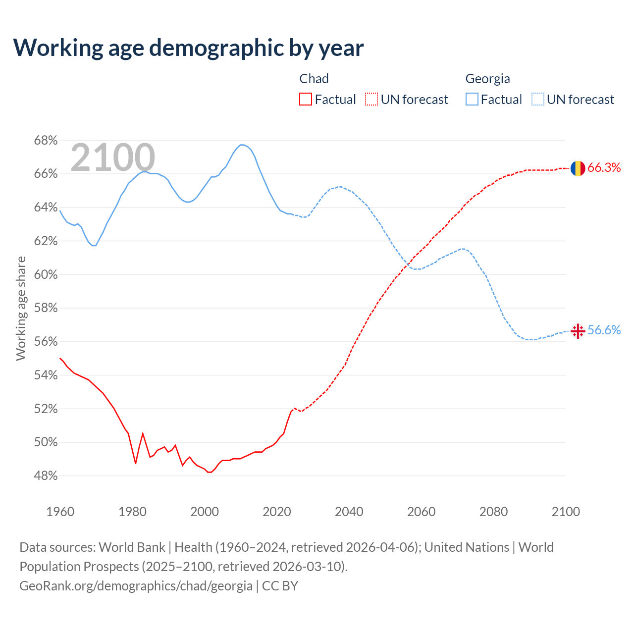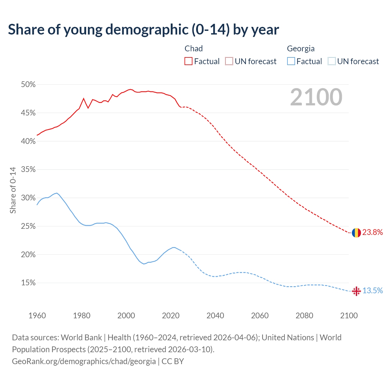 - The share of young demographic (0-15 years old) in Chad is 46.1% vs 20.8% in Georgia.