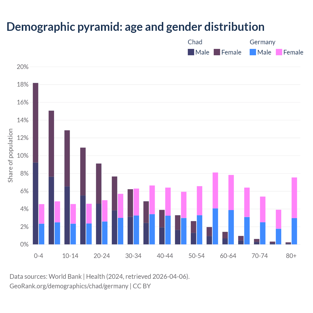 - The share of old-age demographic (65+) in Chad is 2.1% vs 23.2% in Germany.