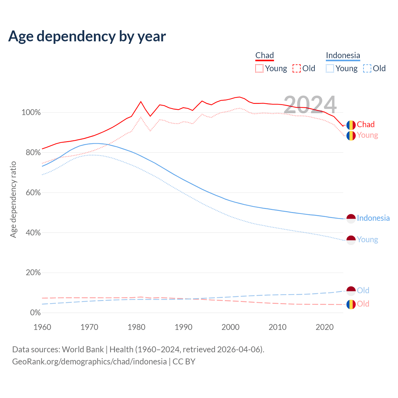 - Chad is ranked 192/196 by median age (oldest to youngest) vs 93/196 for Indonesia.