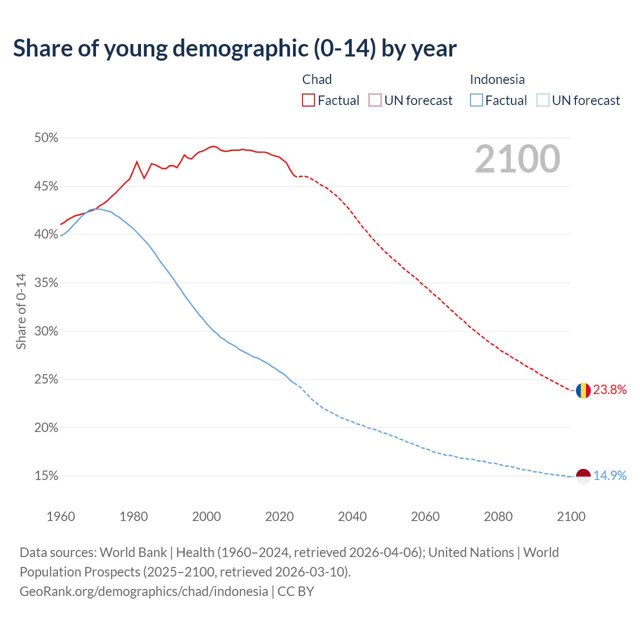 - The share of young demographic (0-15 years old) in Chad is 46.1% vs 24.6% in Indonesia.