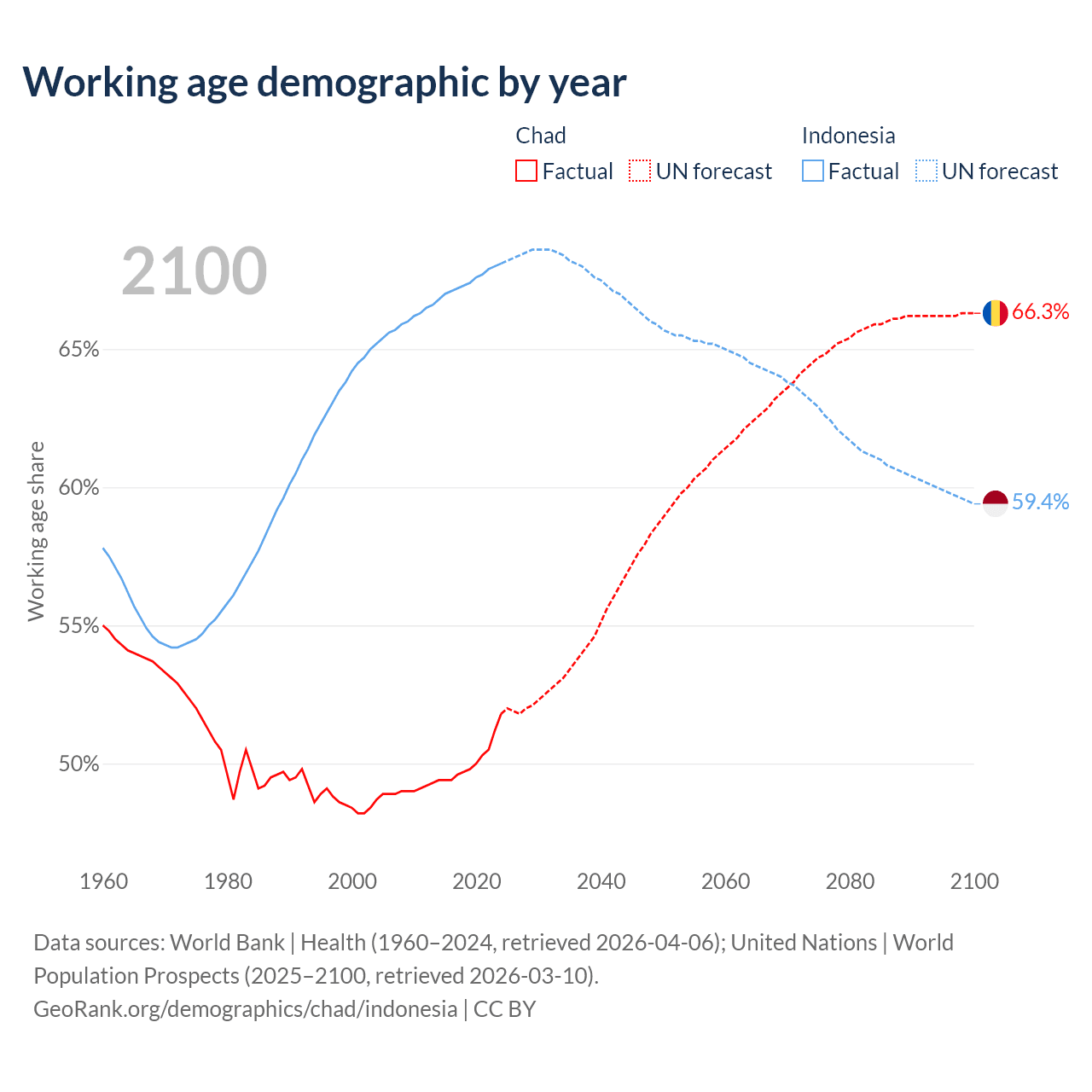 - Chad has 11.3M working age adults (aged 15-64) vs 197M in Indonesia.