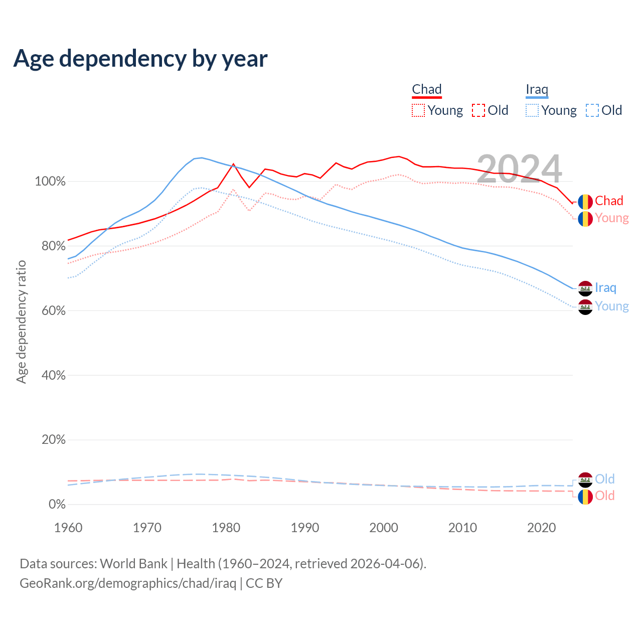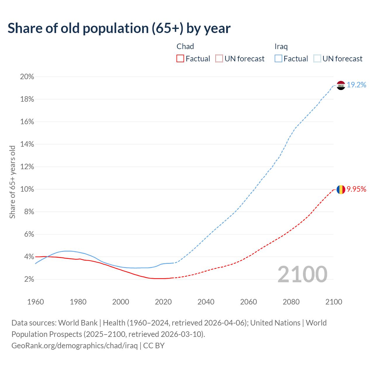 - The share of old-age demographic (65+) in Chad is 2.1% vs 3.41% in Iraq.