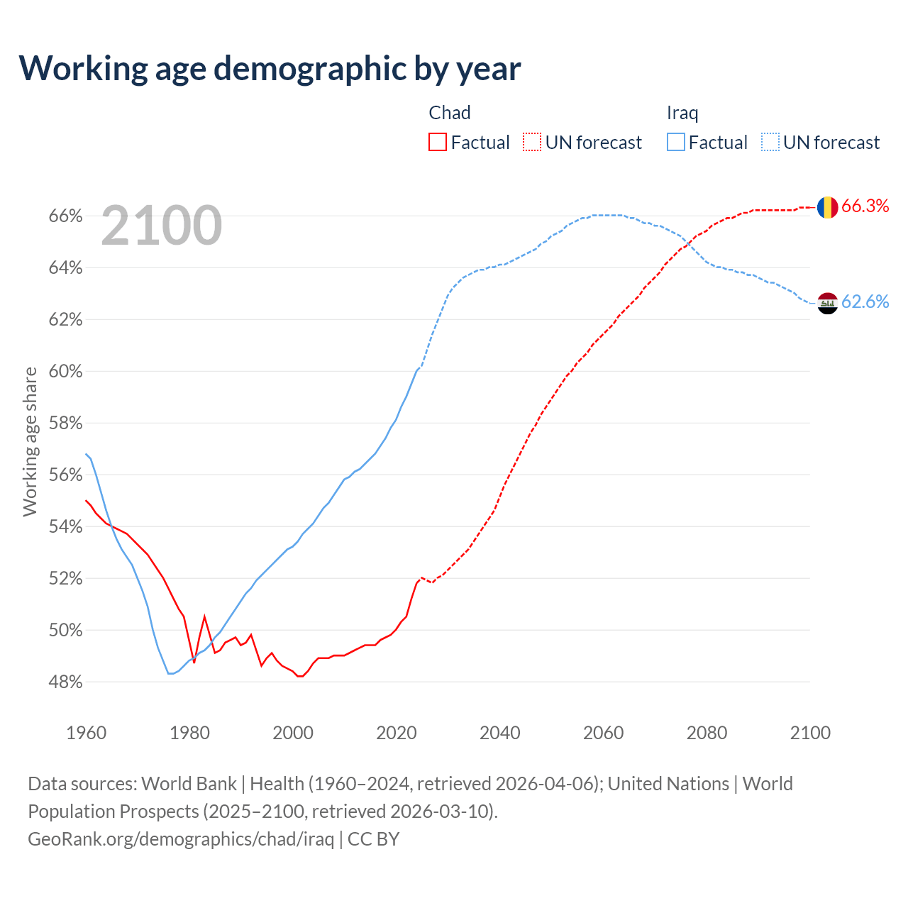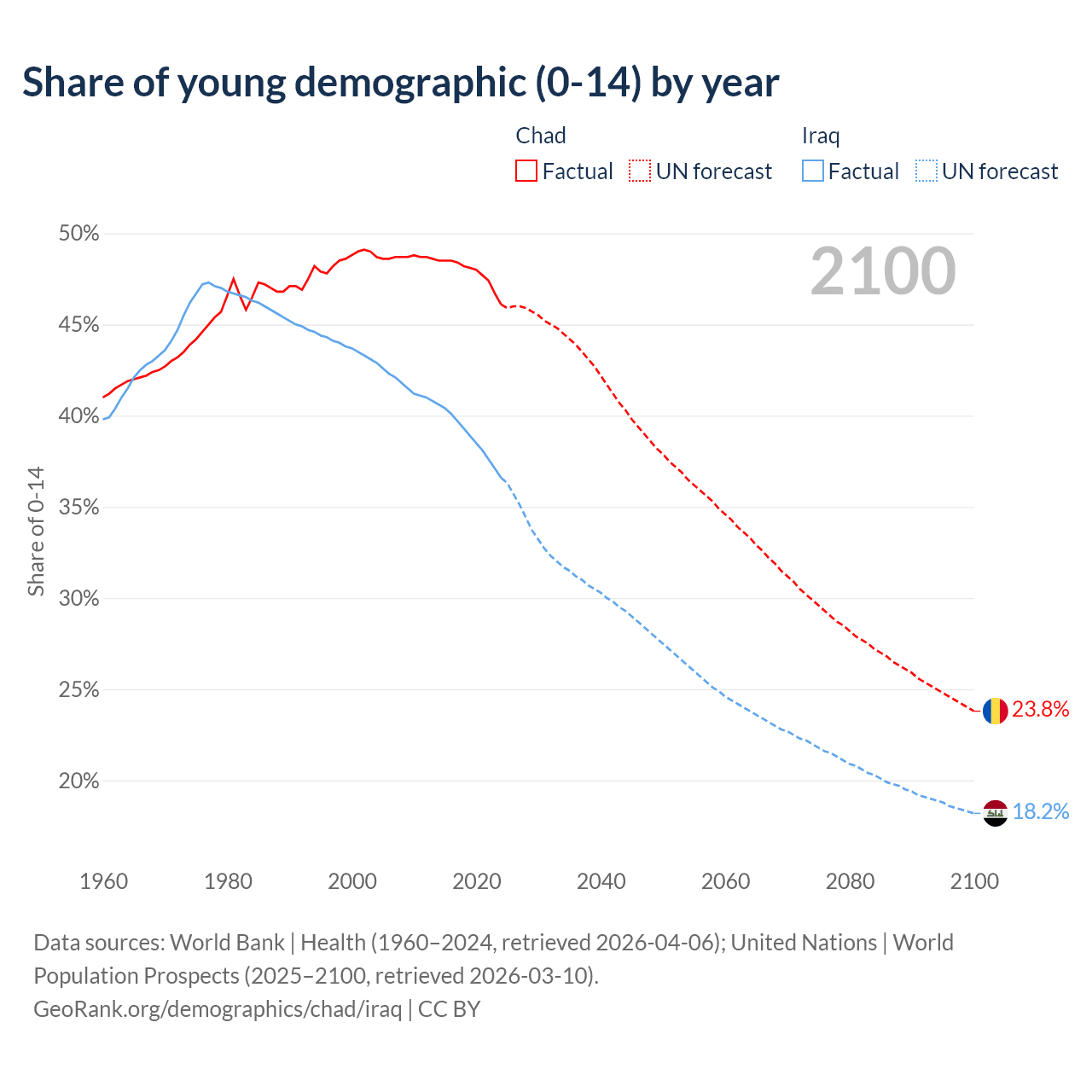 - The share of young demographic (0-15 years old) in Chad is 46.1% vs 36.6% in Iraq.