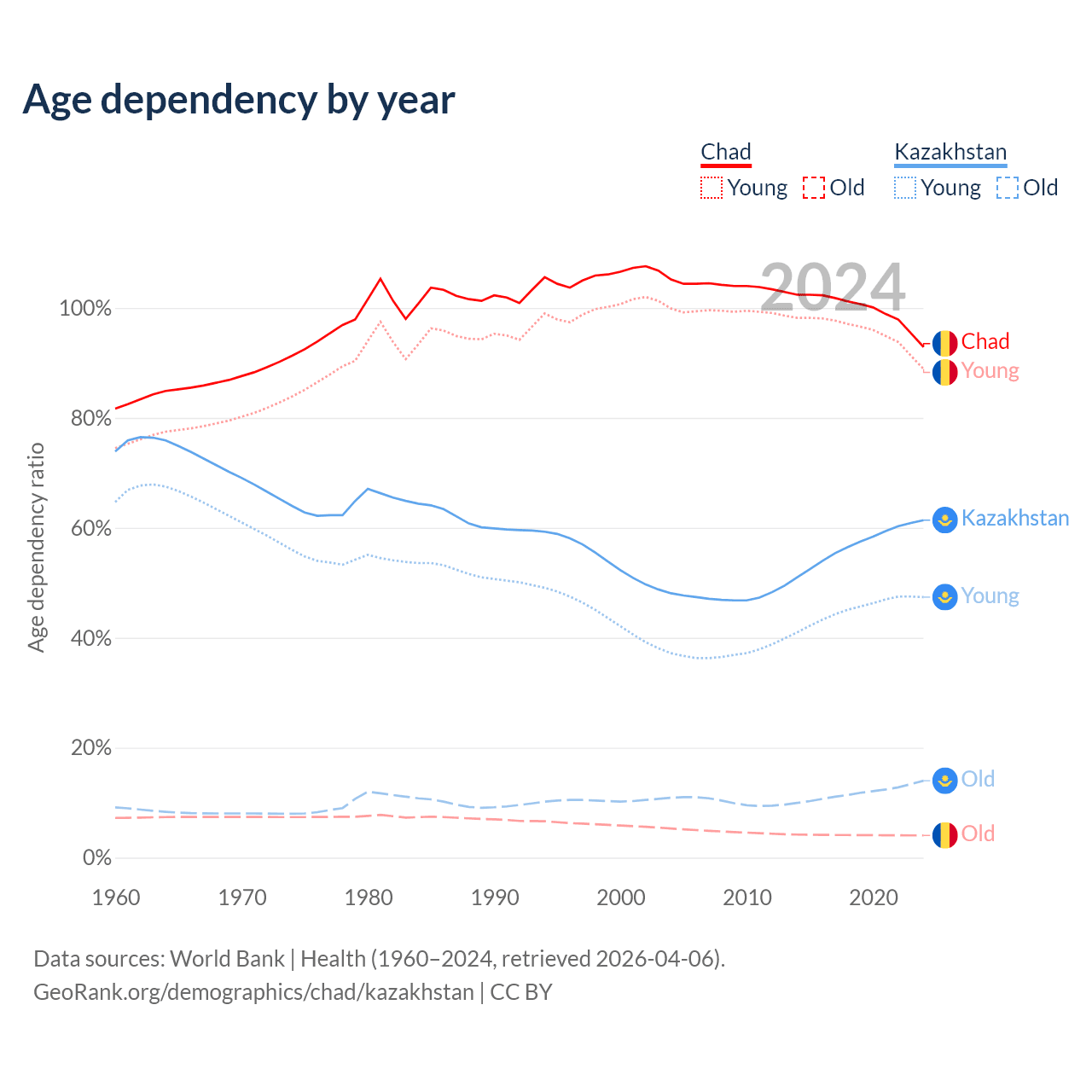 - Chad is ranked 192/196 by median age (oldest to youngest) vs 99/196 for Kazakhstan.
