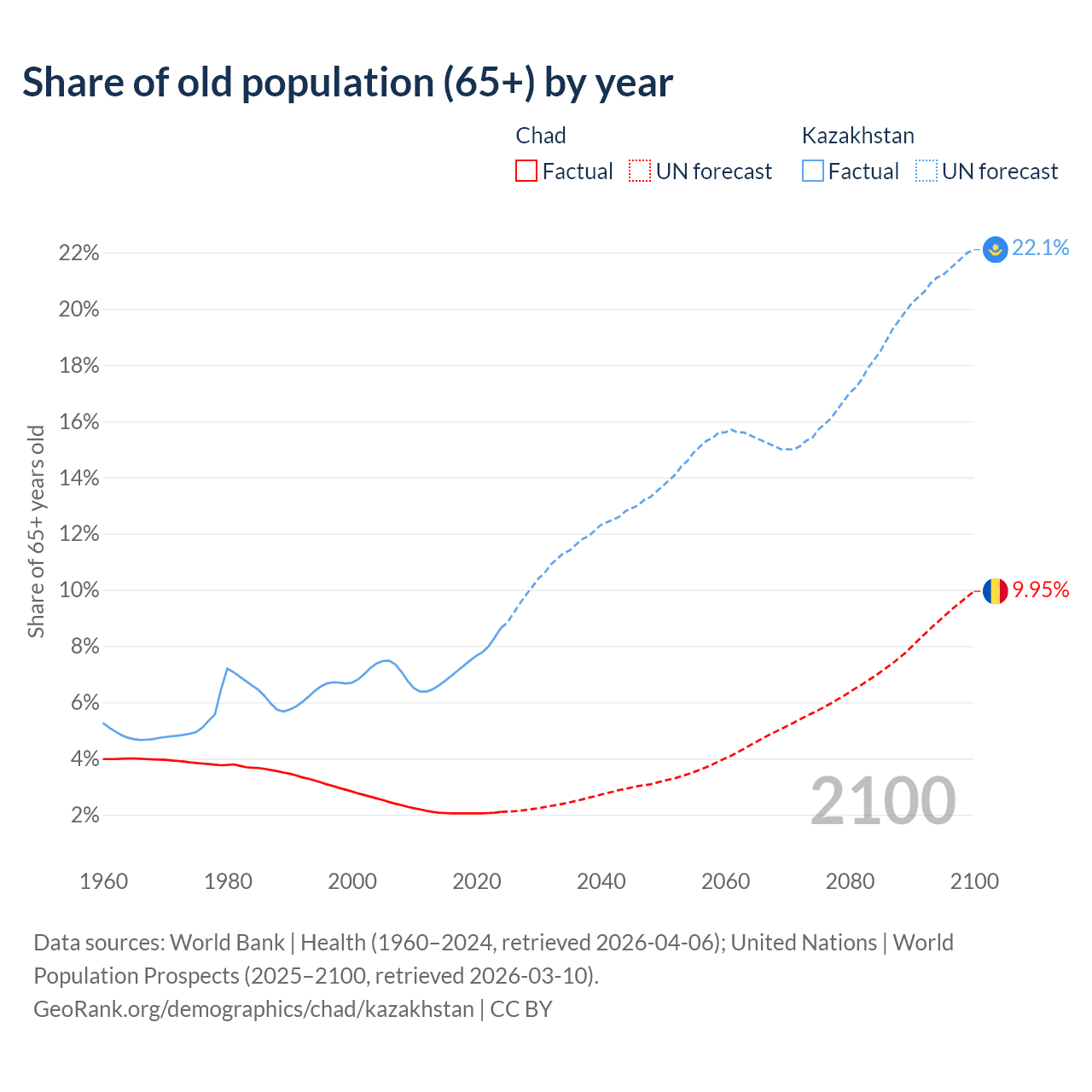 The share of older people aged 65 and over is 2.1% in Chad and 8.65% in Kazakhstan. Life expectancy in Chad compared to Kazakhstan .
