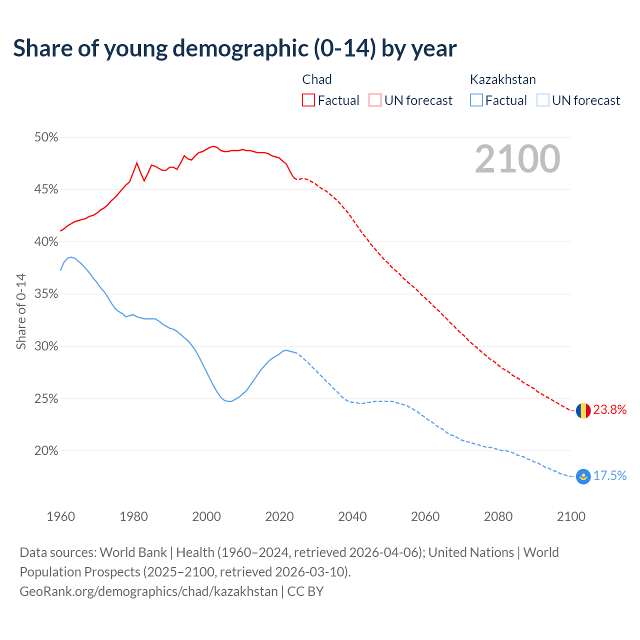 - The share of young demographic (0-15 years old) in Chad is 46.1% vs 29.4% in Kazakhstan.