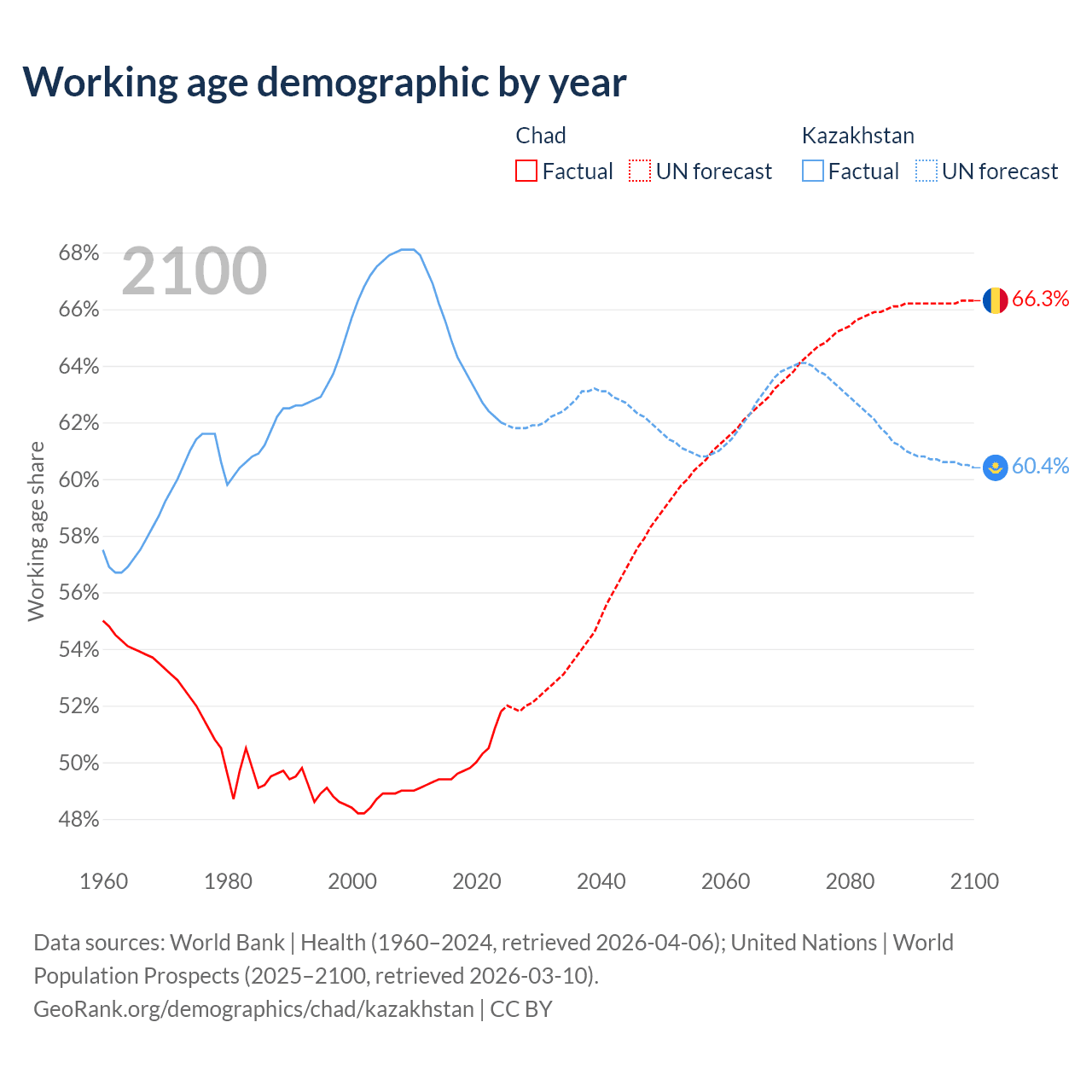 - Chad has 11.3M working age adults (aged 15-64) vs 13.1M in Kazakhstan.