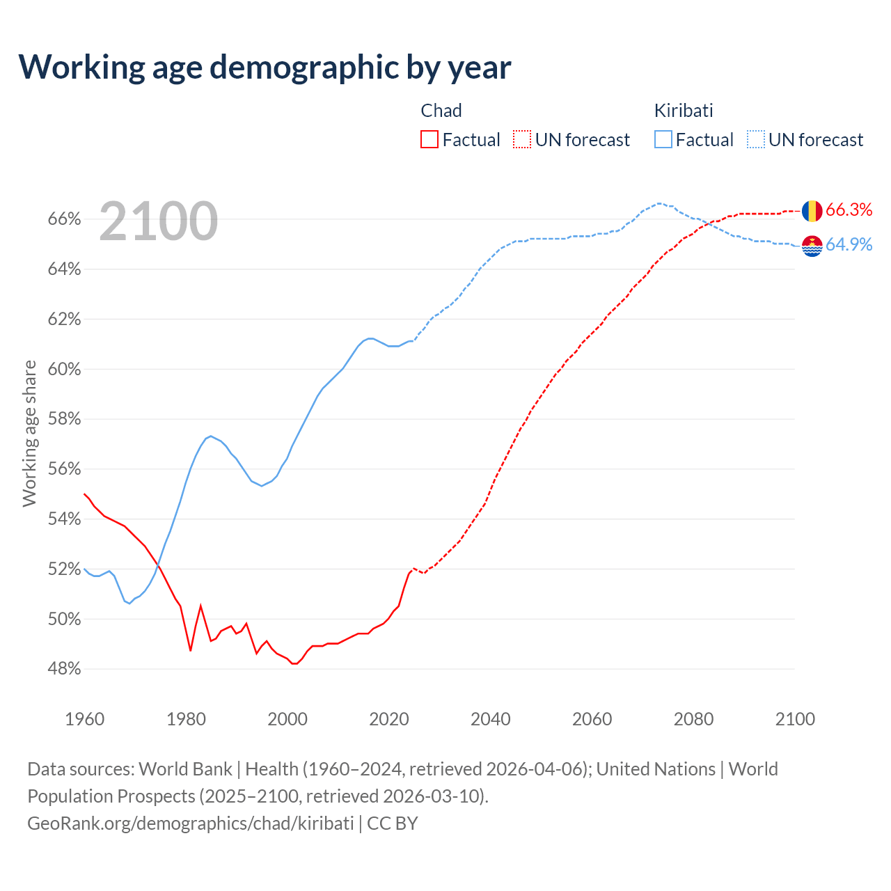 - The share of young demographic (0-15 years old) in Chad is 46.1% vs 34.7% in Kiribati.