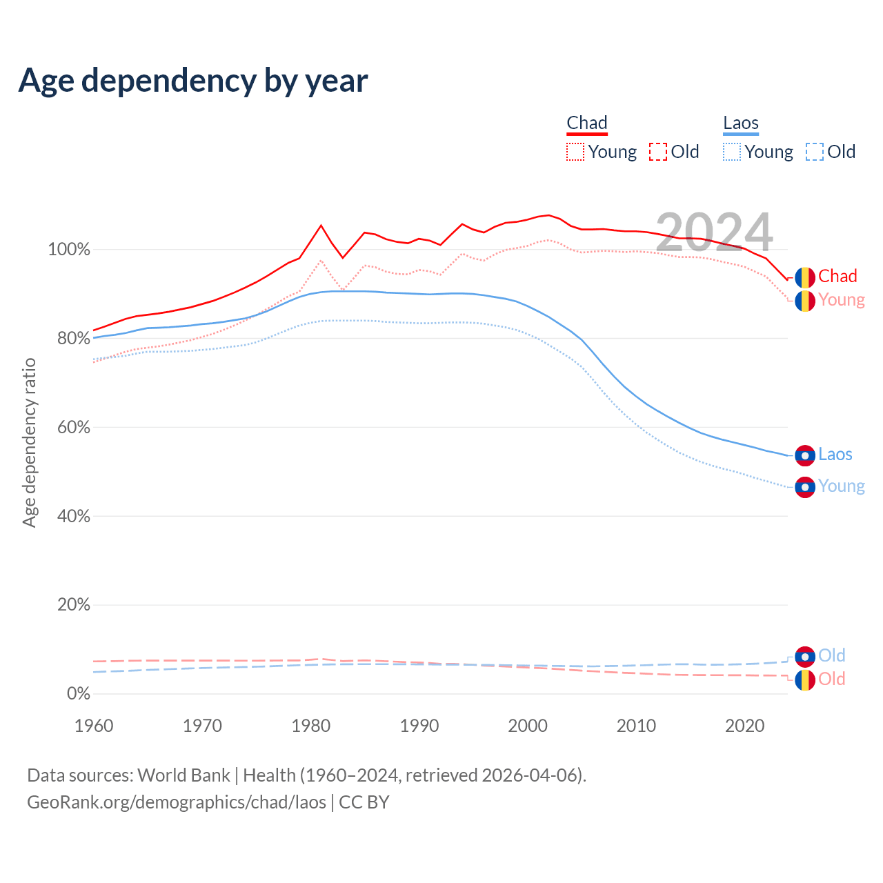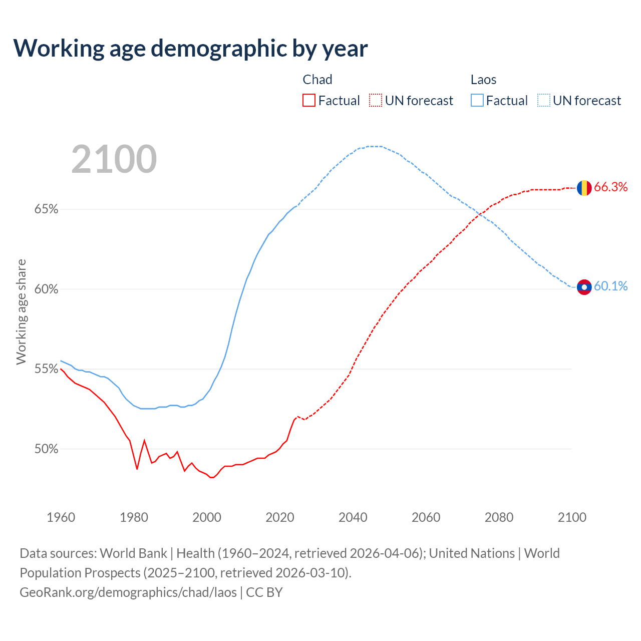 - The share of young demographic (0-15 years old) in Chad is 46.1% vs 30.2% in Laos.
