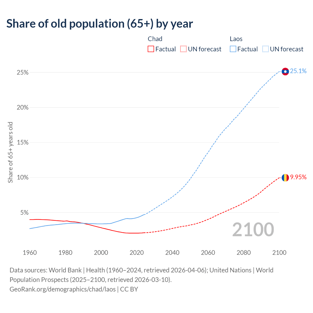 The share of older people aged 65 and over is 2.1% in Chad and 4.67% in Laos. Life expectancy in Chad compared to Laos .