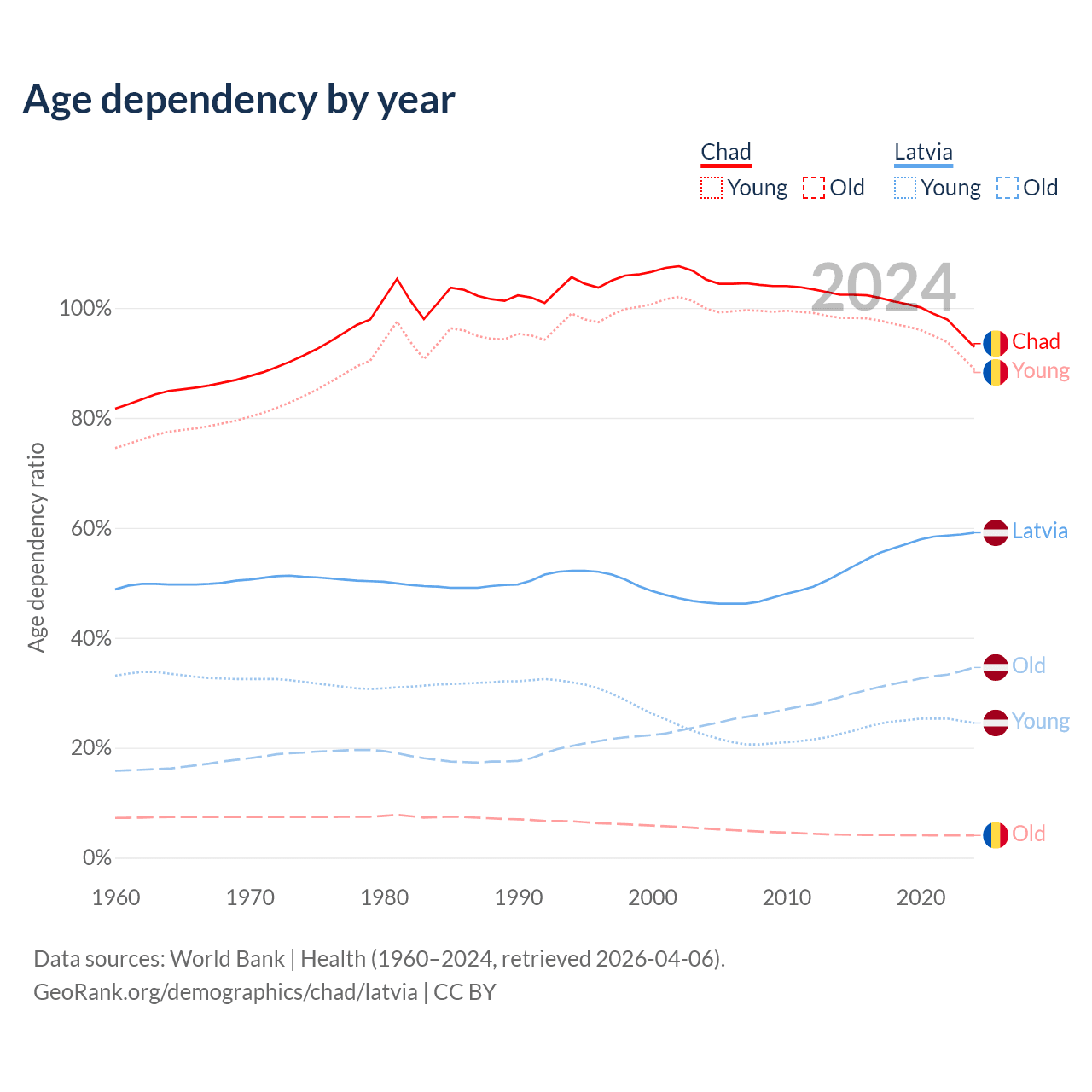 - The share of old-age demographic (65+) in Chad is 2.1% vs 21.7% in Latvia.