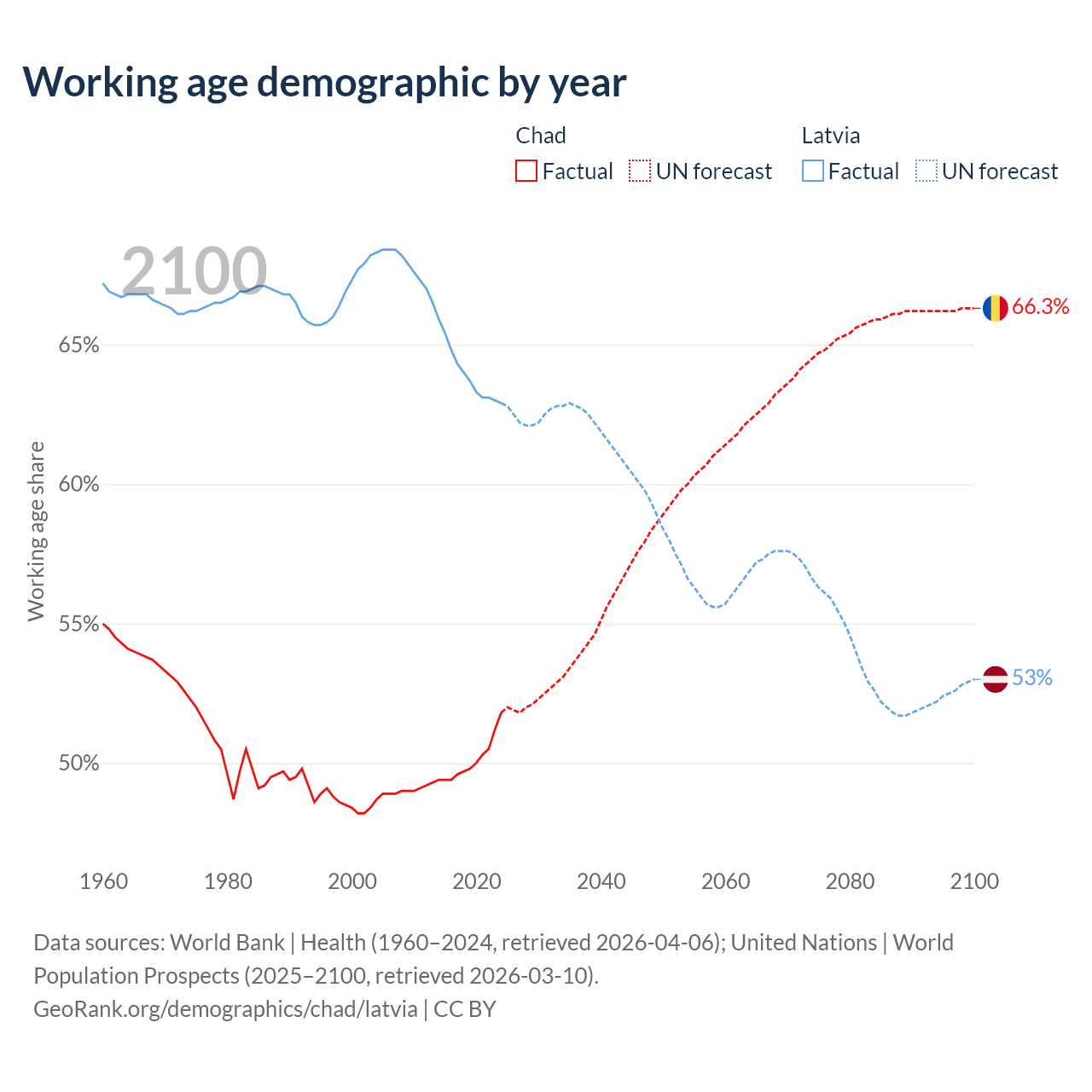 - Chad has 11.3M working age adults (aged 15-64) vs 1.15M in Latvia.