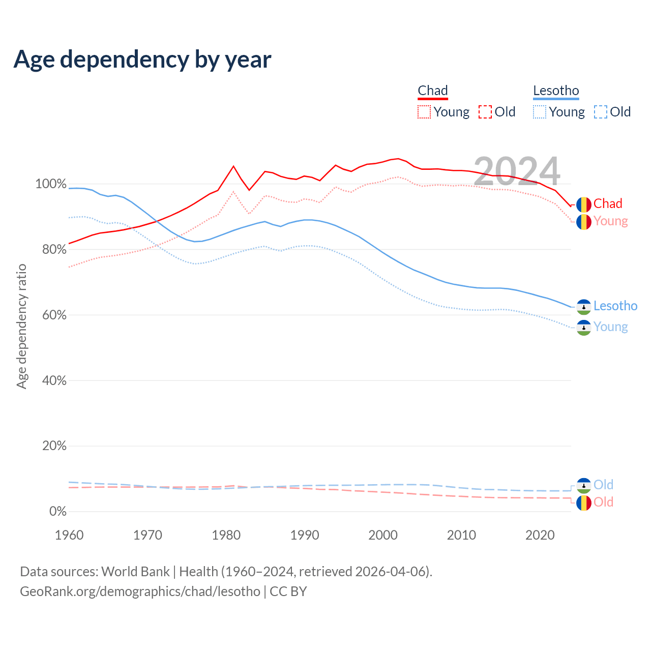 - Chad is ranked 192/196 by median age (oldest to youngest) vs 143/196 for Lesotho.