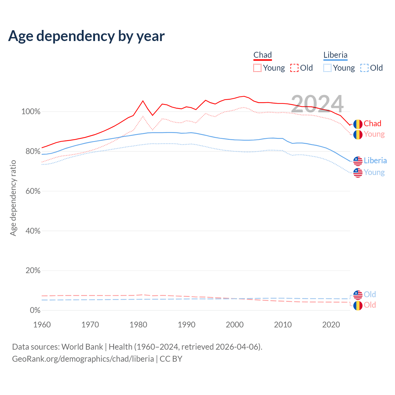 - Chad is ranked 192/196 by median age (oldest to youngest) vs 169/196 for Liberia.