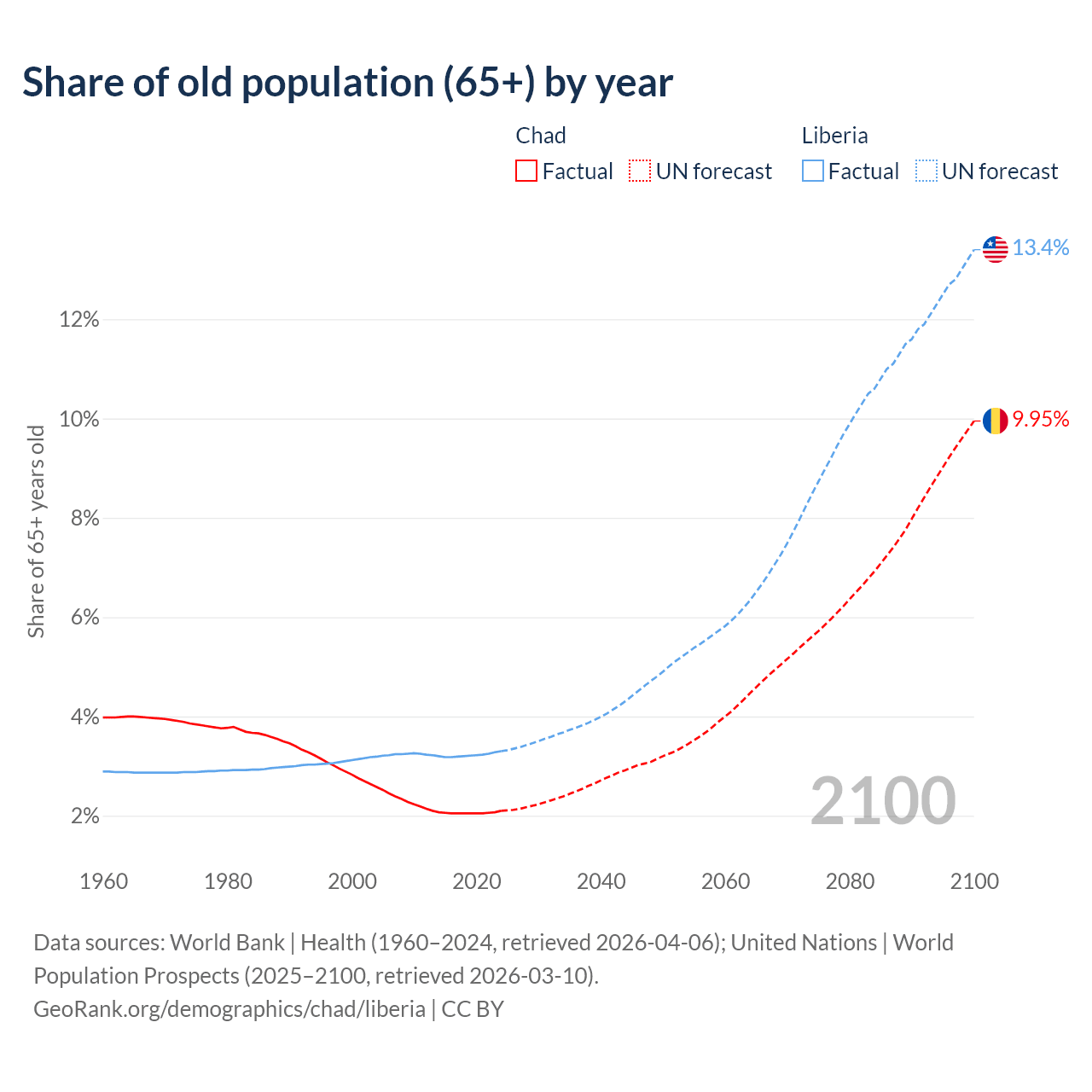 - The share of old-age demographic (65+) in Chad is 2.1% vs 3.3% in Liberia.