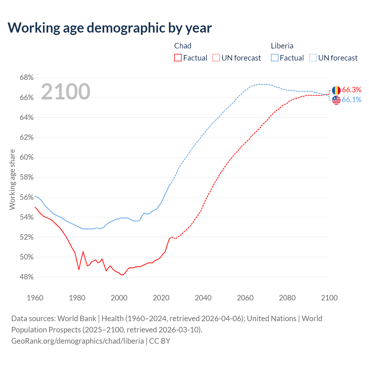- Chad has 11.3M working age adults (aged 15-64) vs 3.37M in Liberia.