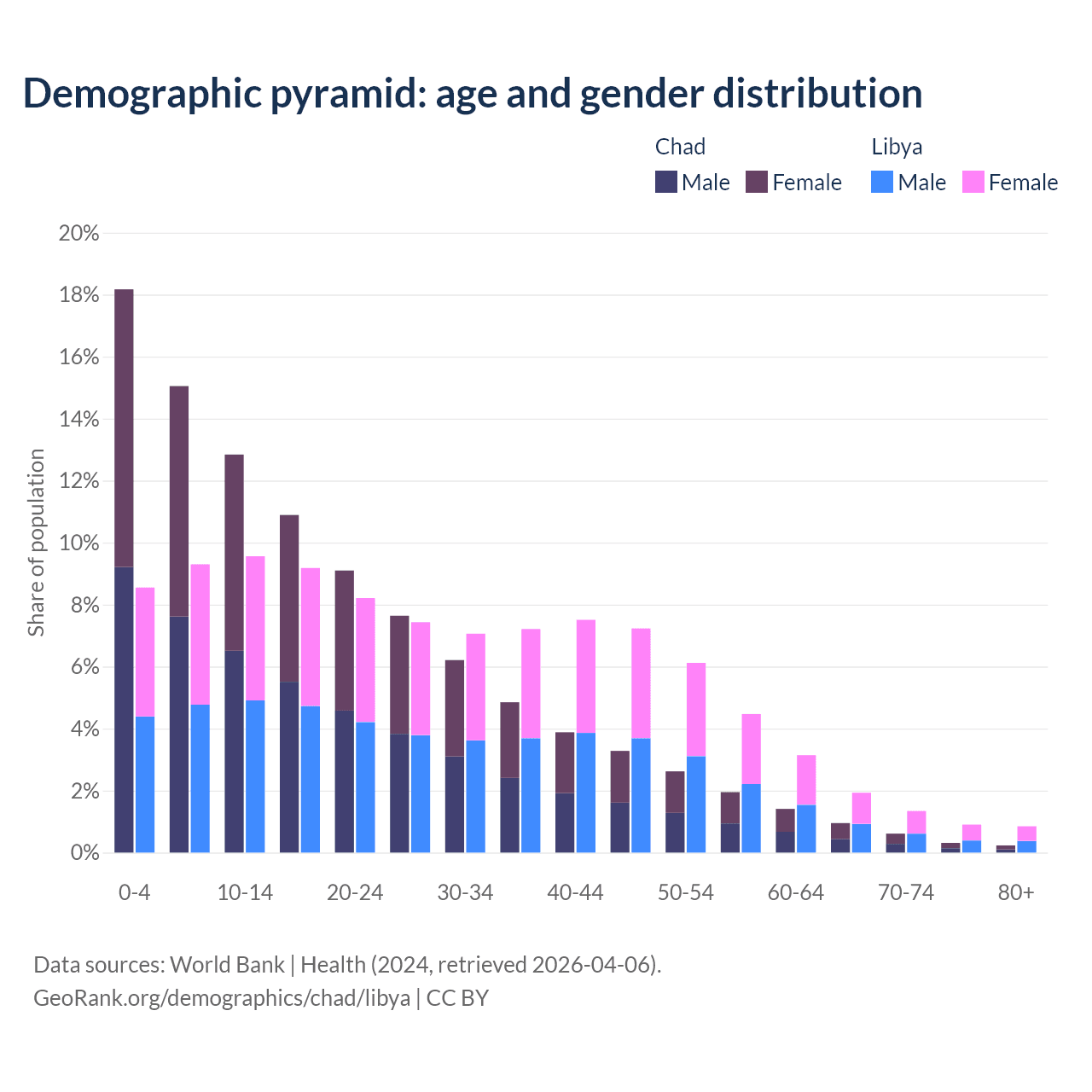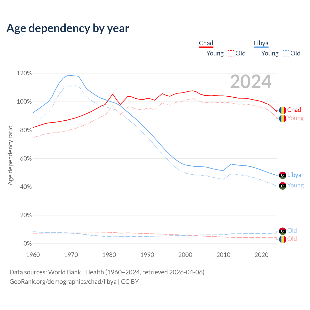 - Chad is ranked 192/196 by median age (oldest to youngest) vs 114/196 for Libya.