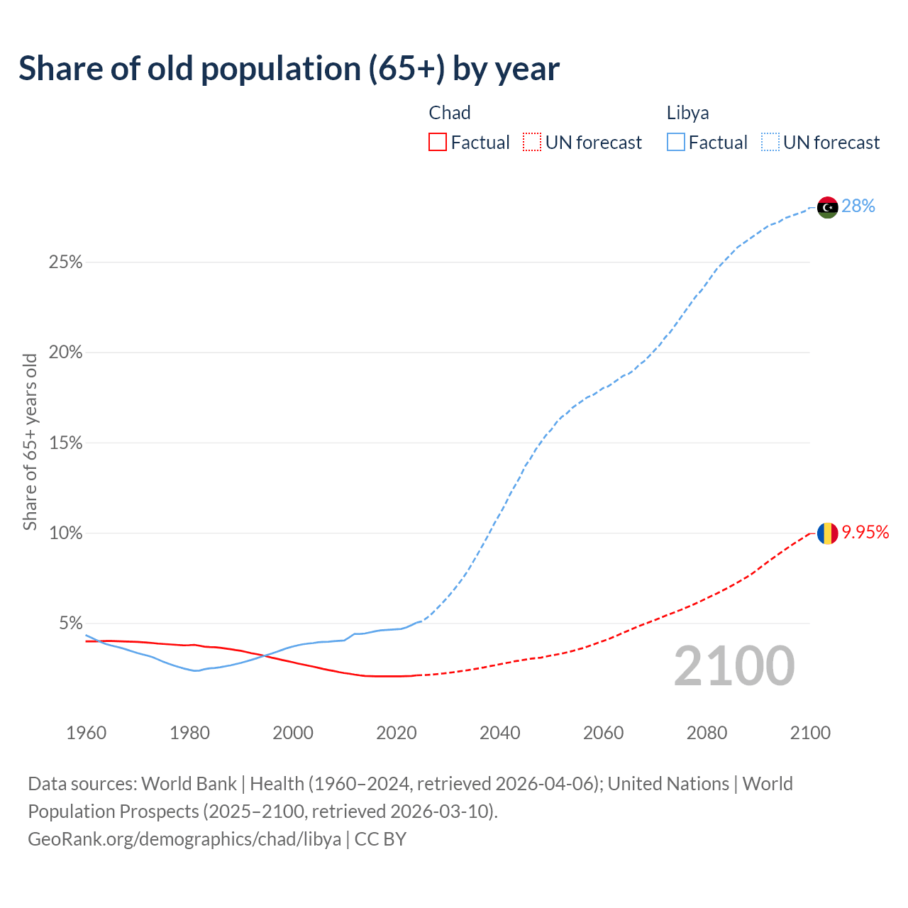 The share of older people aged 65 and over is 2.1% in Chad and 5.02% in Libya. Life expectancy in Chad compared to Libya .