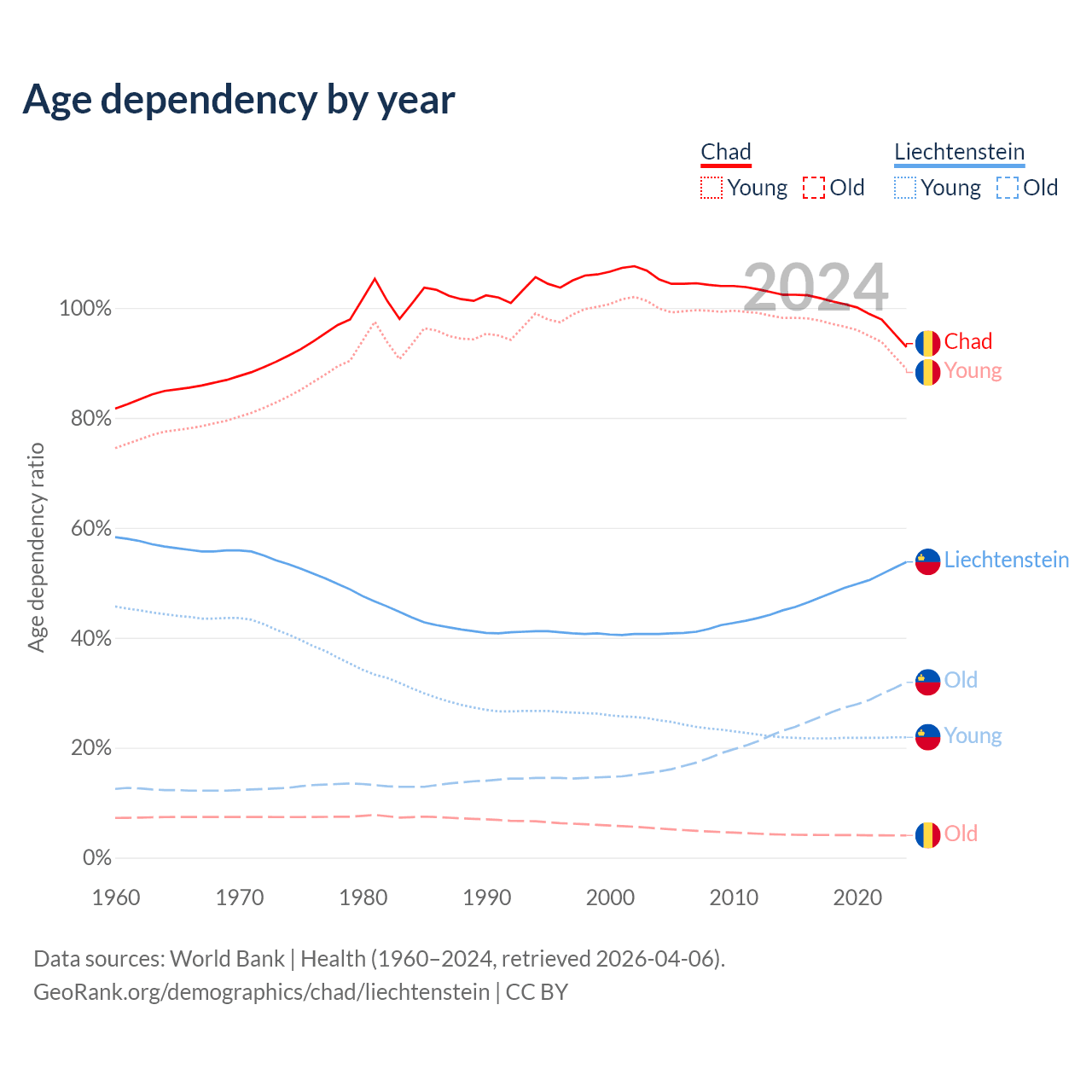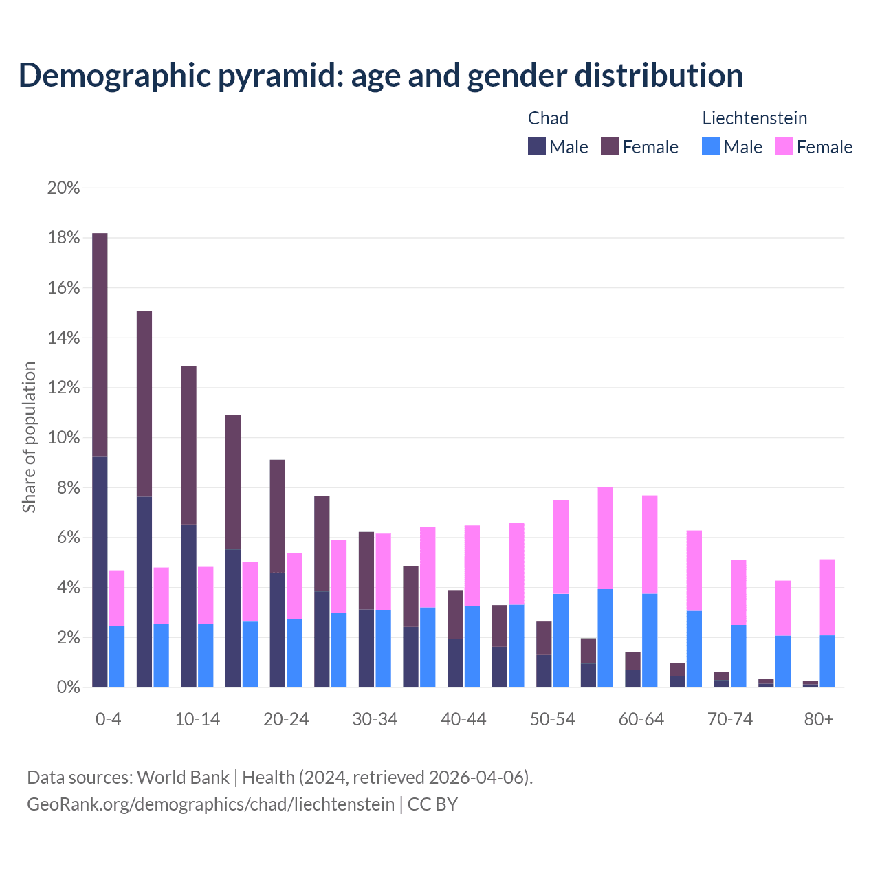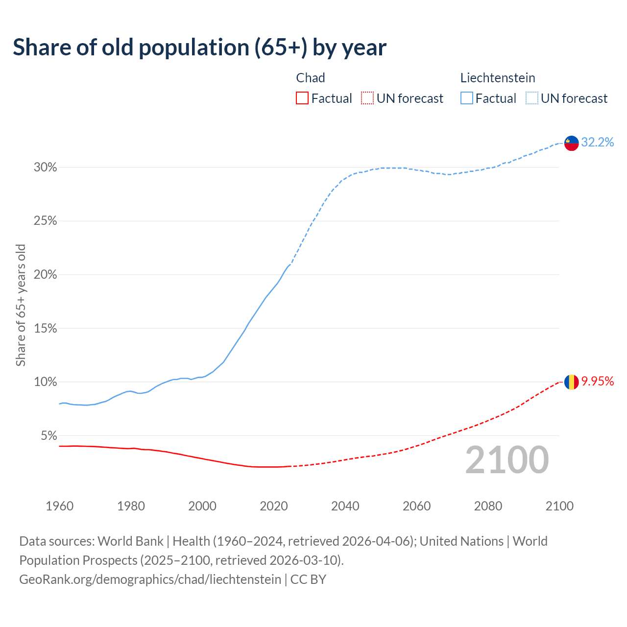 - The share of old-age demographic (65+) in Chad is 2.1% vs 20.7% in Liechtenstein.