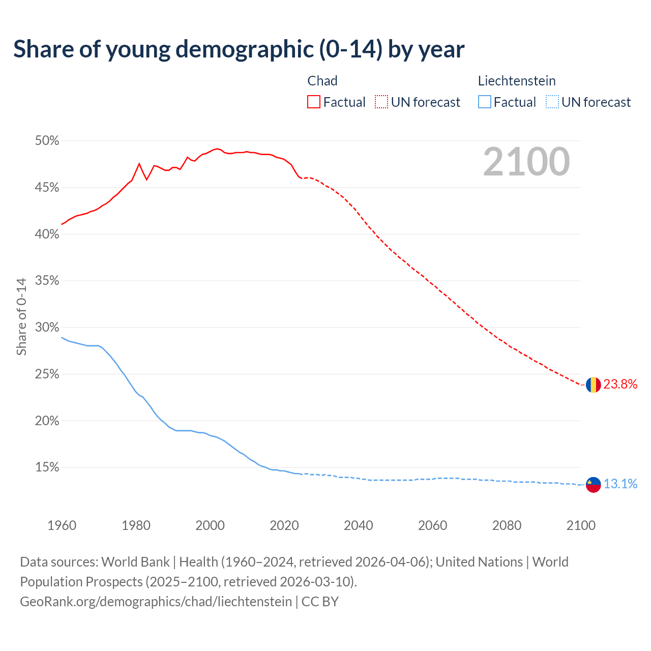 - The share of young demographic (0-15 years old) in Chad is 46.1% vs 14.3% in Liechtenstein.