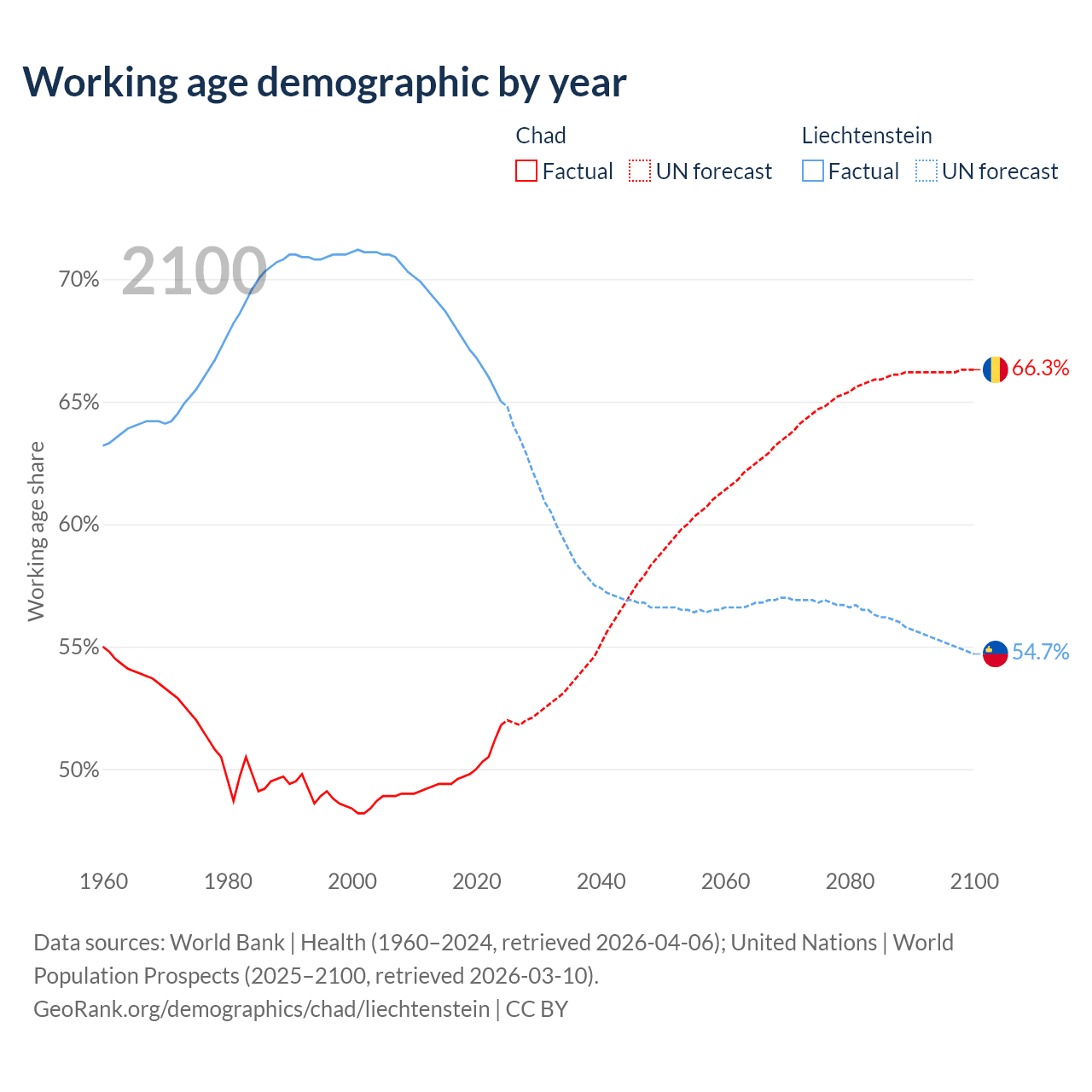 - Chad has 11.3M working age adults (aged 15-64) vs 26.7K in Liechtenstein.