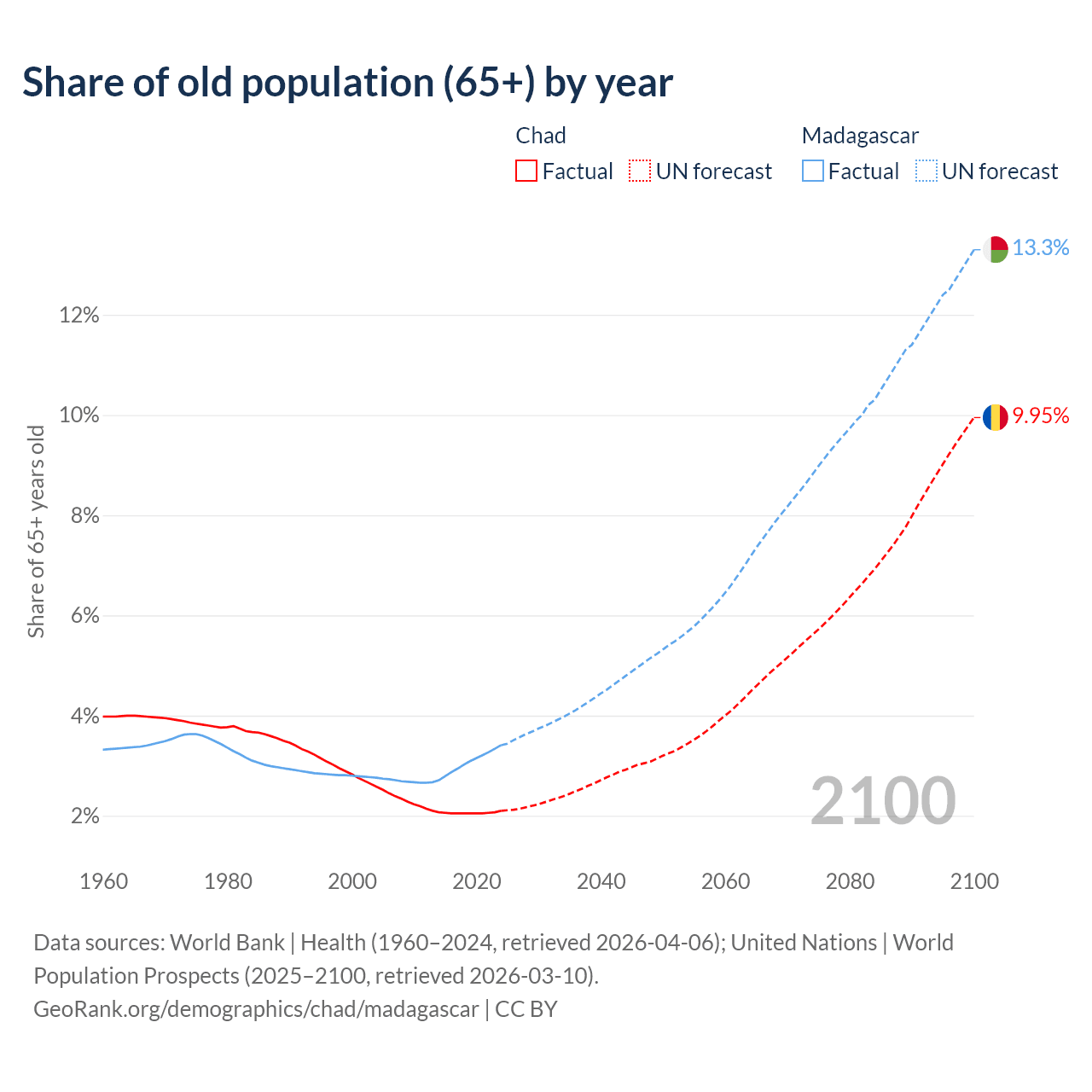 The share of older people aged 65 and over is 2.1% in Chad and 3.41% in Madagascar. Life expectancy in Chad compared to Madagascar .
