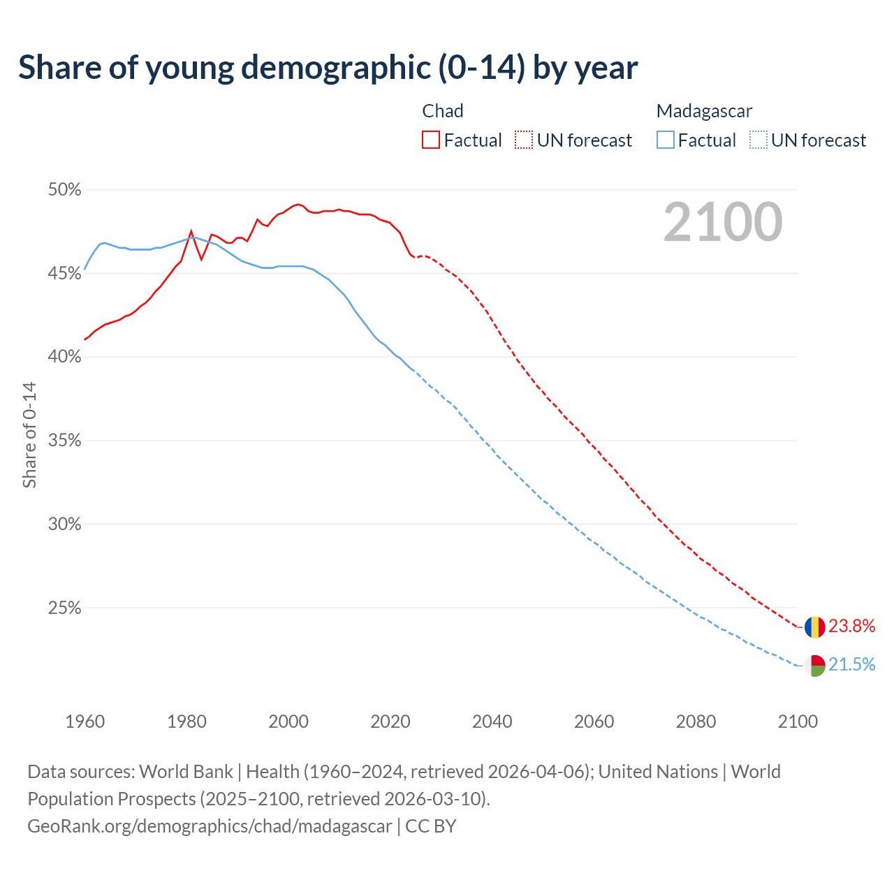 - The share of young demographic (0-15 years old) in Chad is 46.1% vs 39.3% in Madagascar.