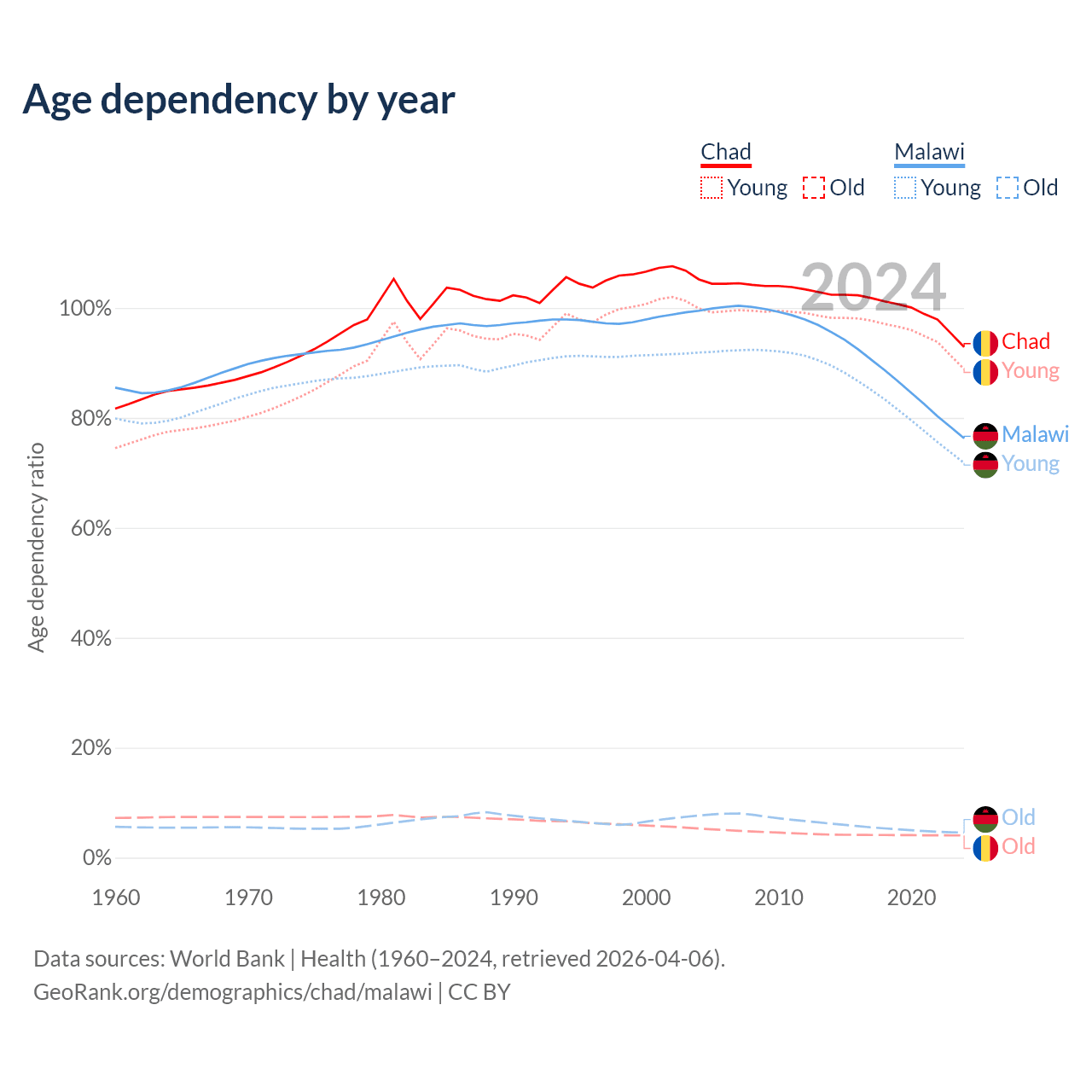 - Chad is ranked 192/196 by median age (oldest to youngest) vs 181/196 for Malawi.