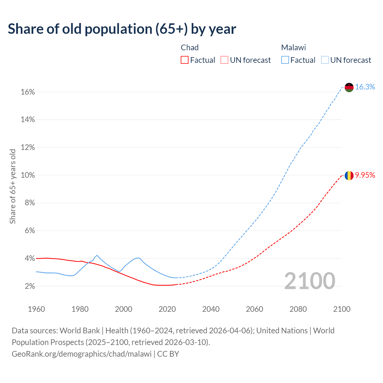 The share of older people aged 65 and over is 2.1% in Chad and 2.59% in Malawi. Life expectancy in Chad compared to Malawi .