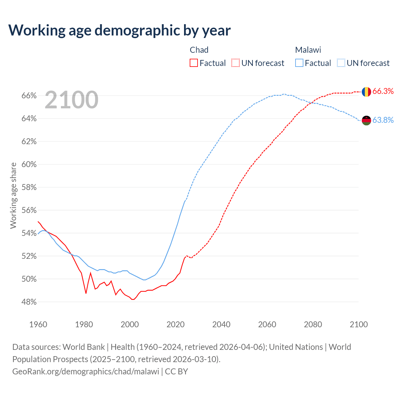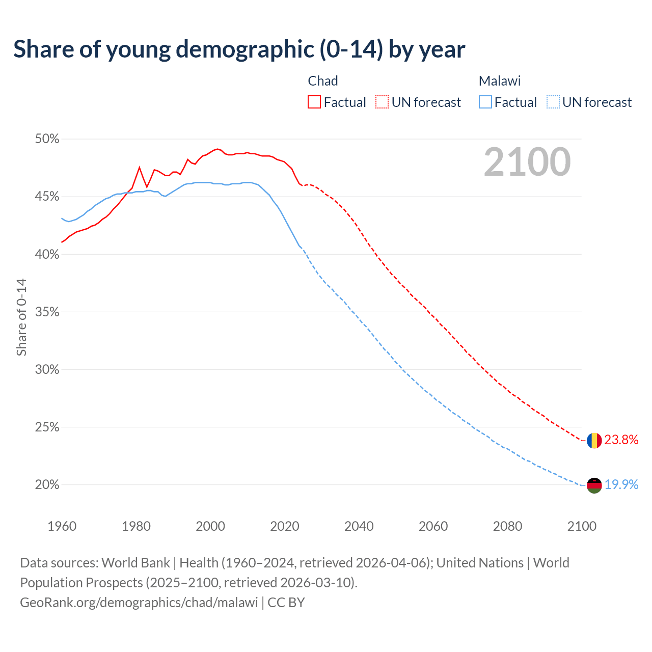 - The share of young demographic (0-15 years old) in Chad is 46.1% vs 40.7% in Malawi.
