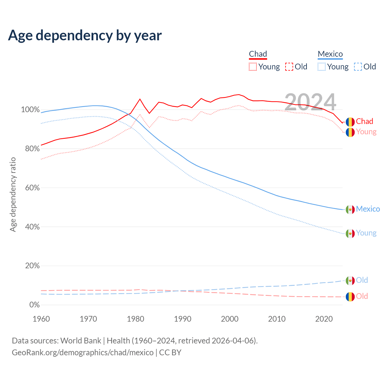 - Chad is ranked 192/196 by median age (oldest to youngest) vs 102/196 for Mexico.