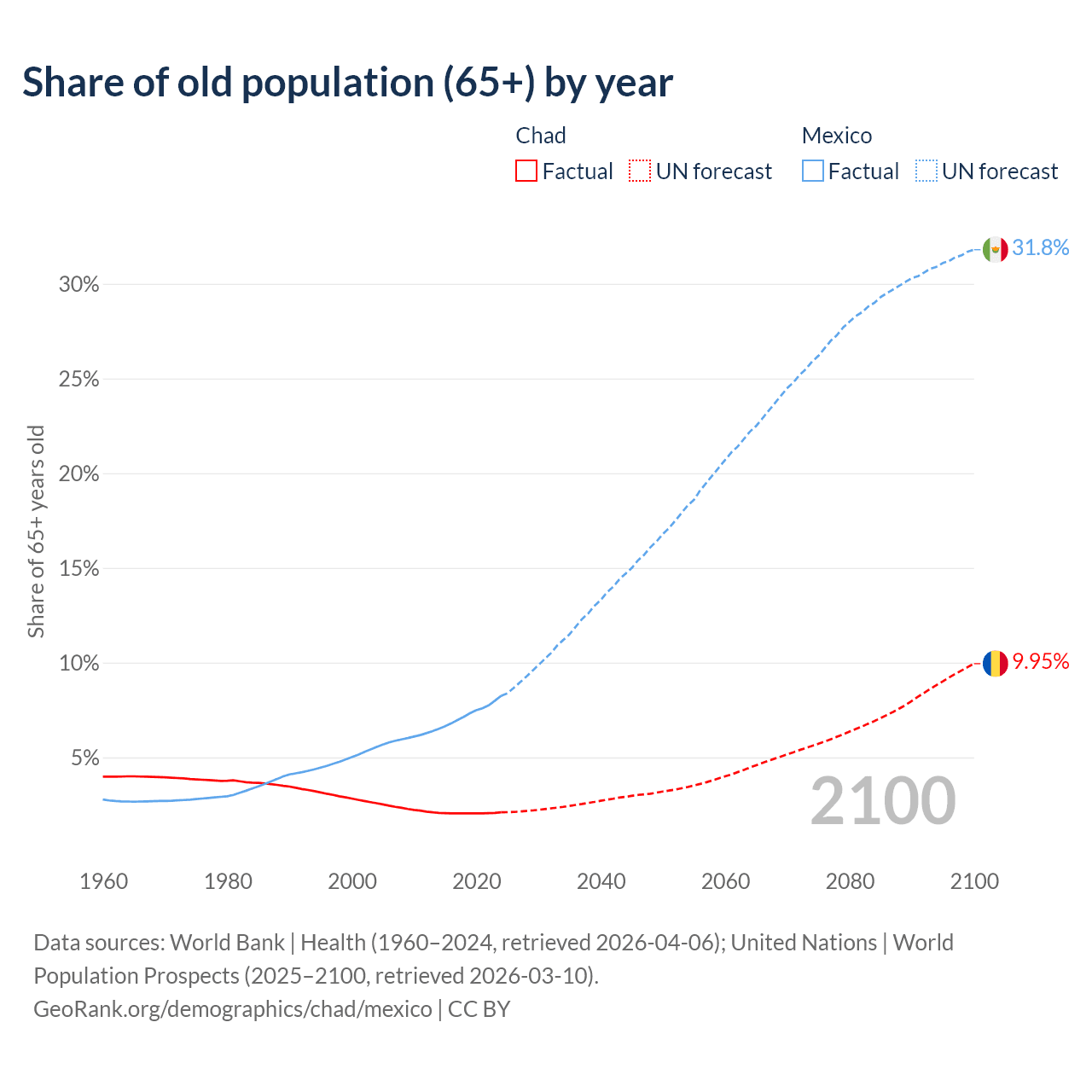 - The share of old-age demographic (65+) in Chad is 2.1% vs 8.25% in Mexico.