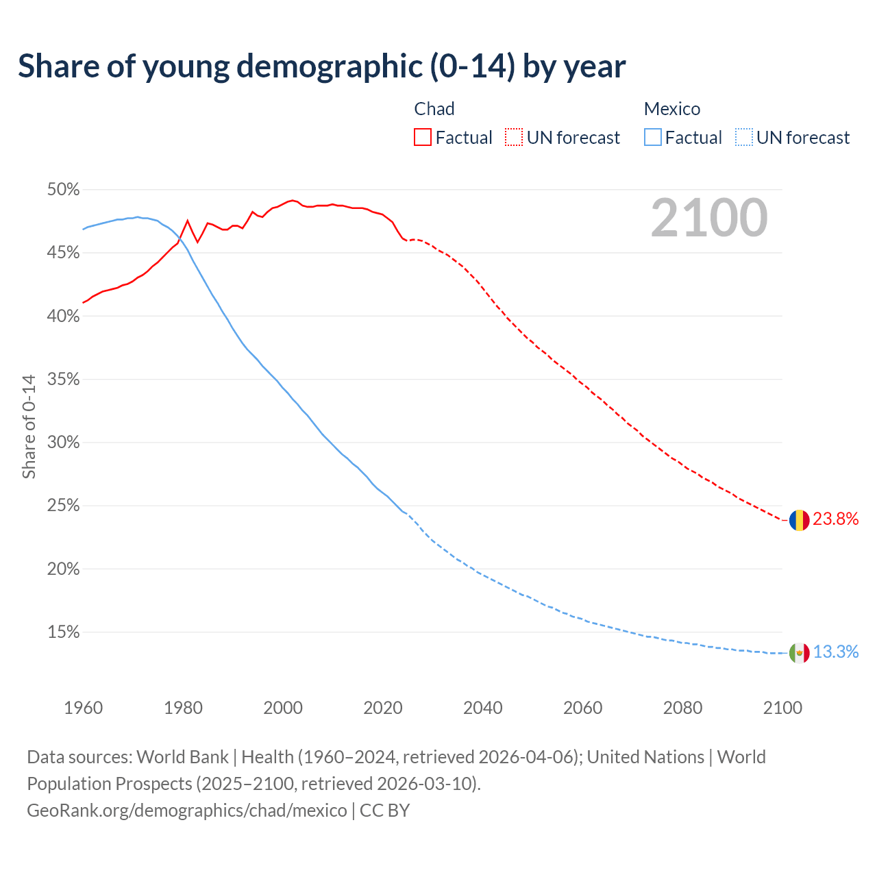 - The share of young demographic (0-15 years old) in Chad is 46.1% vs 24.5% in Mexico.