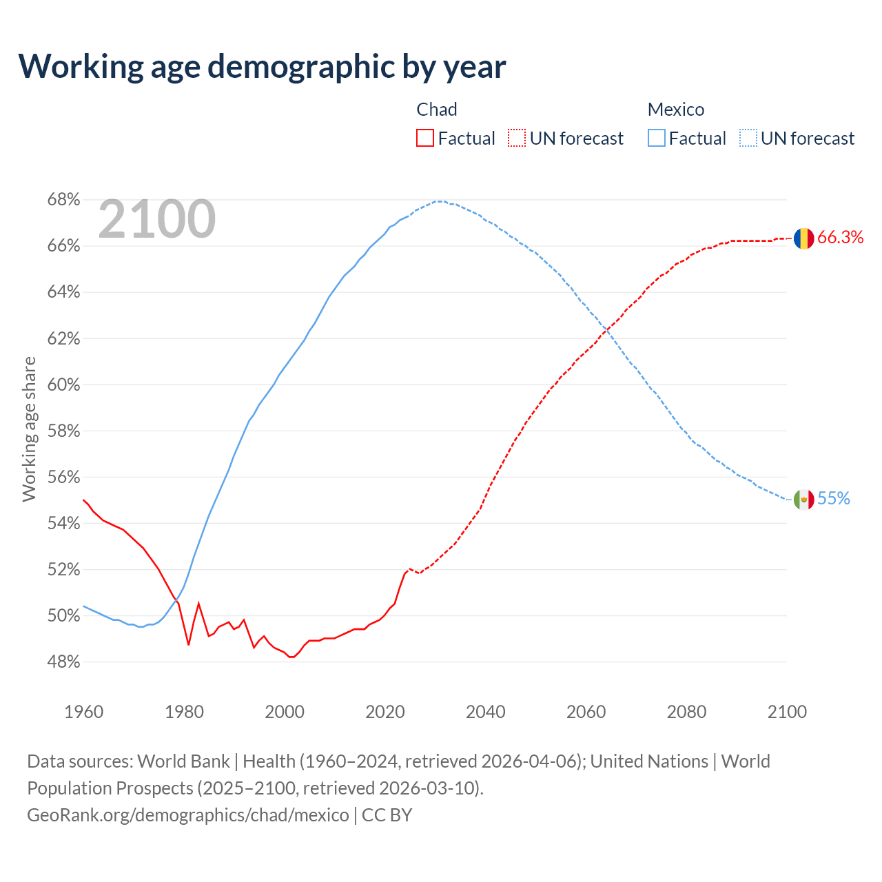 - Chad has 11.3M working age adults (aged 15-64) vs 89.6M in Mexico.